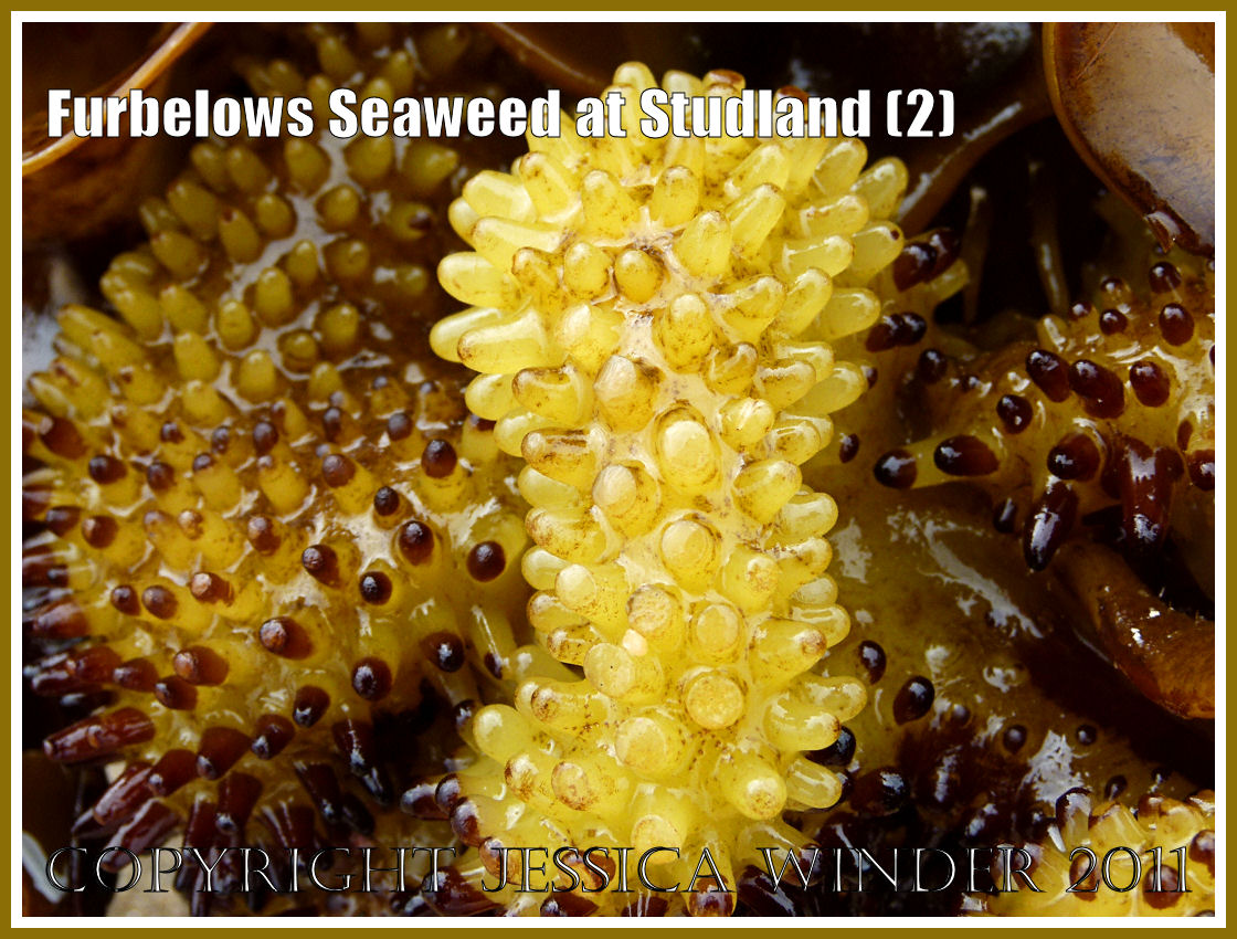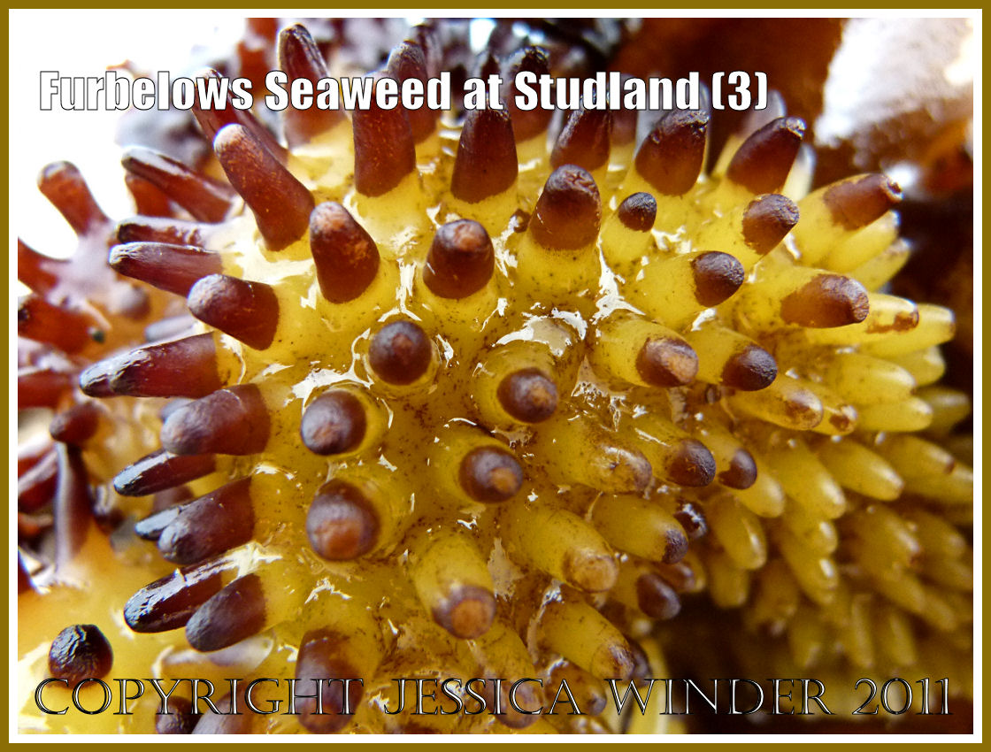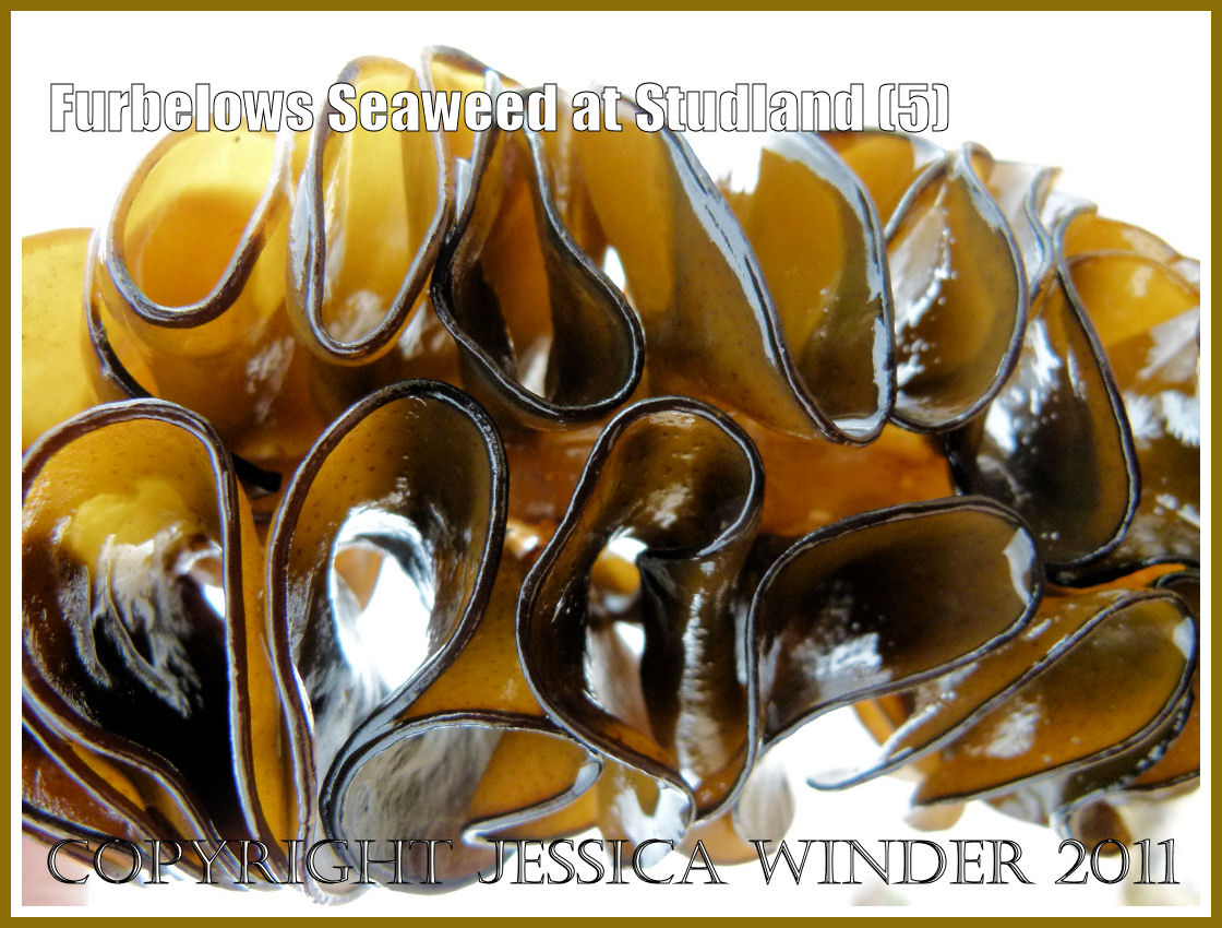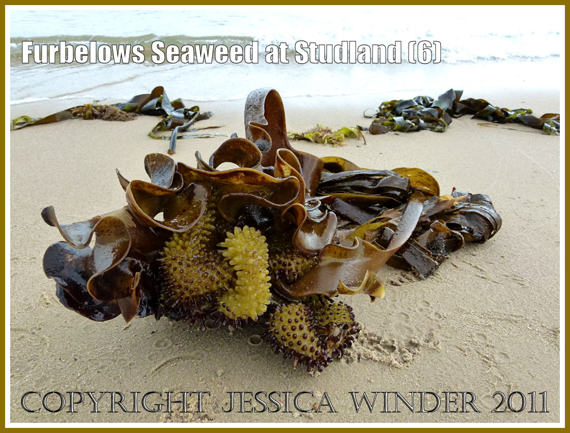 The seaweed that had washed ashore most frequently, when I recently visited Studland beach, was a brown kelp commonly called Furbelows, with the Latin name Saccorhiza polyschides (Lightfoot) Batters. The interesting features of this common British brown alga (Phaeophyceae) are the odd bulbous hollow holdfast with its warty surface texture and ‘rootlets; and the curious thin, flat, wavy, and folded edges that project from the stem. Both of these characters are shown in close-up photographs here. I have also written about this species in earlier posts where you can find more information about FURBELOWS: https://natureinfocus.wordpress.com/?s=Saccorhiza+polyschides.