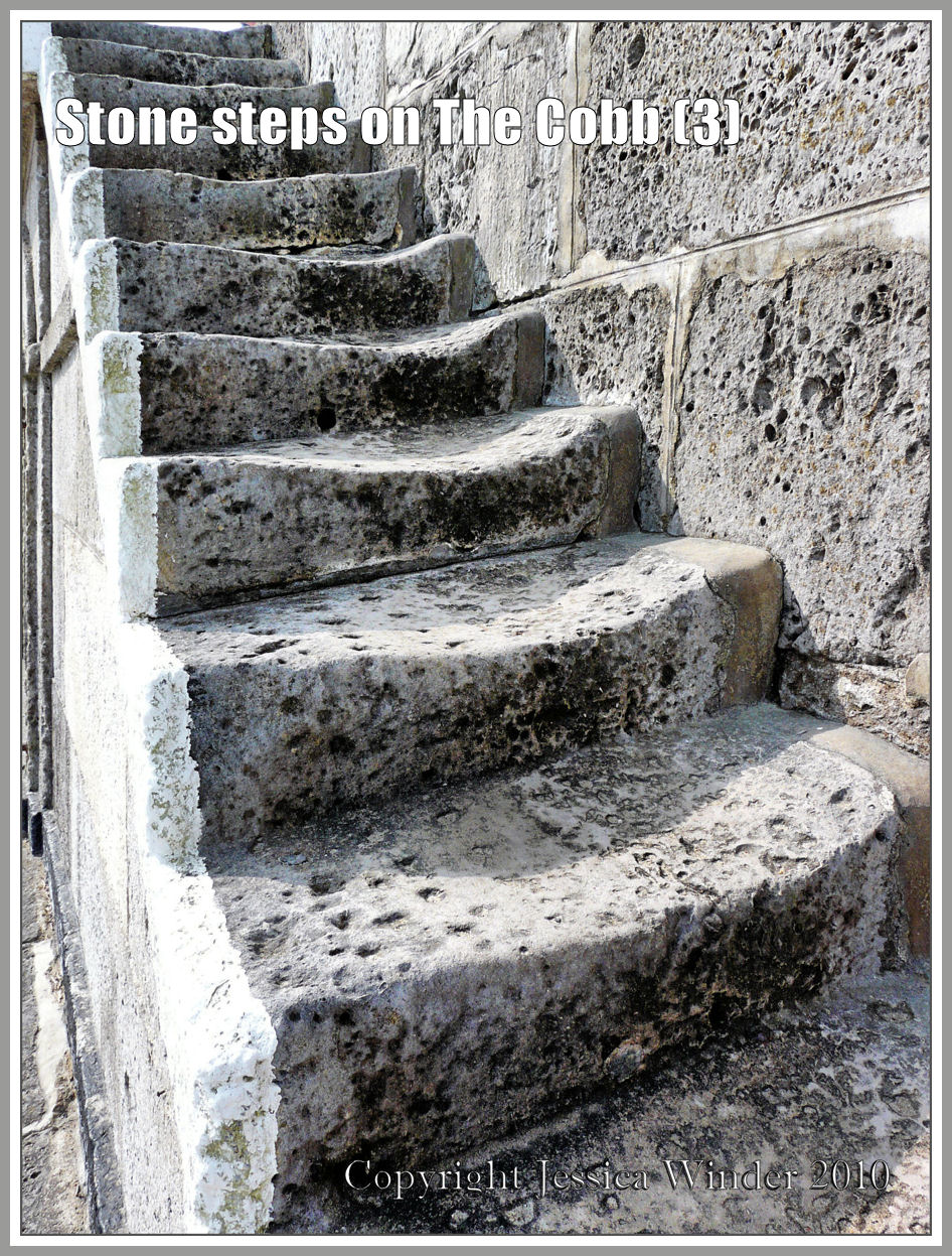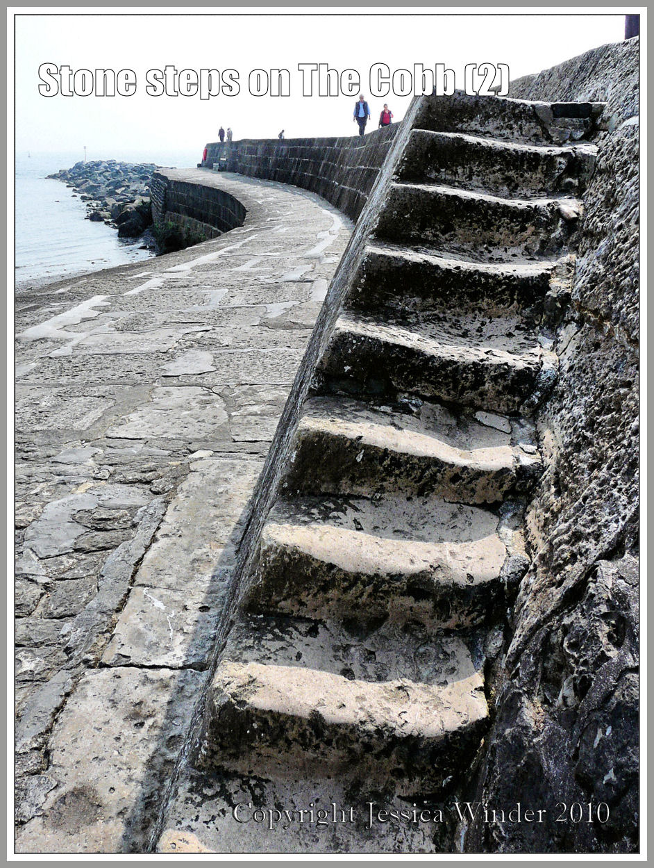 Following on from comments received on yesterday’s blog posting about Portland Roach rock used in the building of The Cobb at Lyme Regis, Dorset, on the Jurassic Coast, here are some pictures of the precarious stone steps on the harbour wall. Does the photograph above show where Louisa Musgrave fell? Or maybe one of the flights of steps shown below? They are certainly very slippery in wet weather and difficult to negotiate when it is windy.