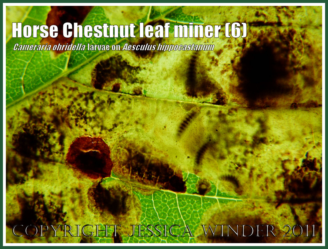 The final image in this post is a short video clip showing the outline shapes of some of these minute leaf-mining caterpillars moving around inside a Horse Chestnut leaf – seen when the leaf was held up against the light.