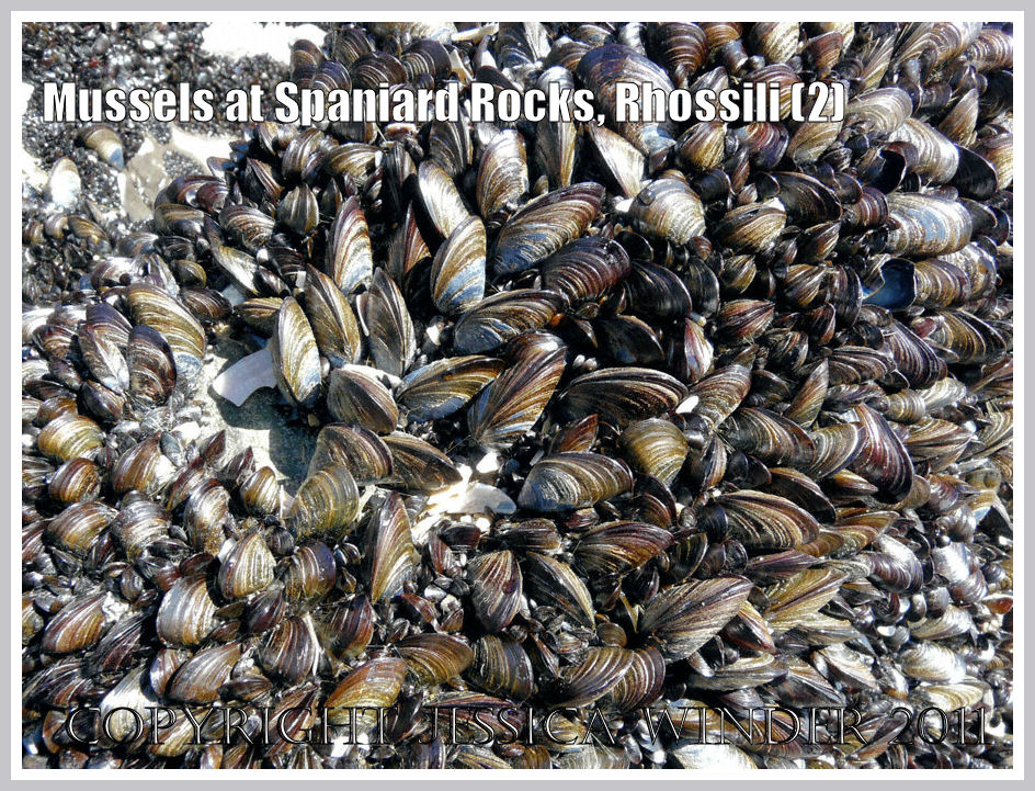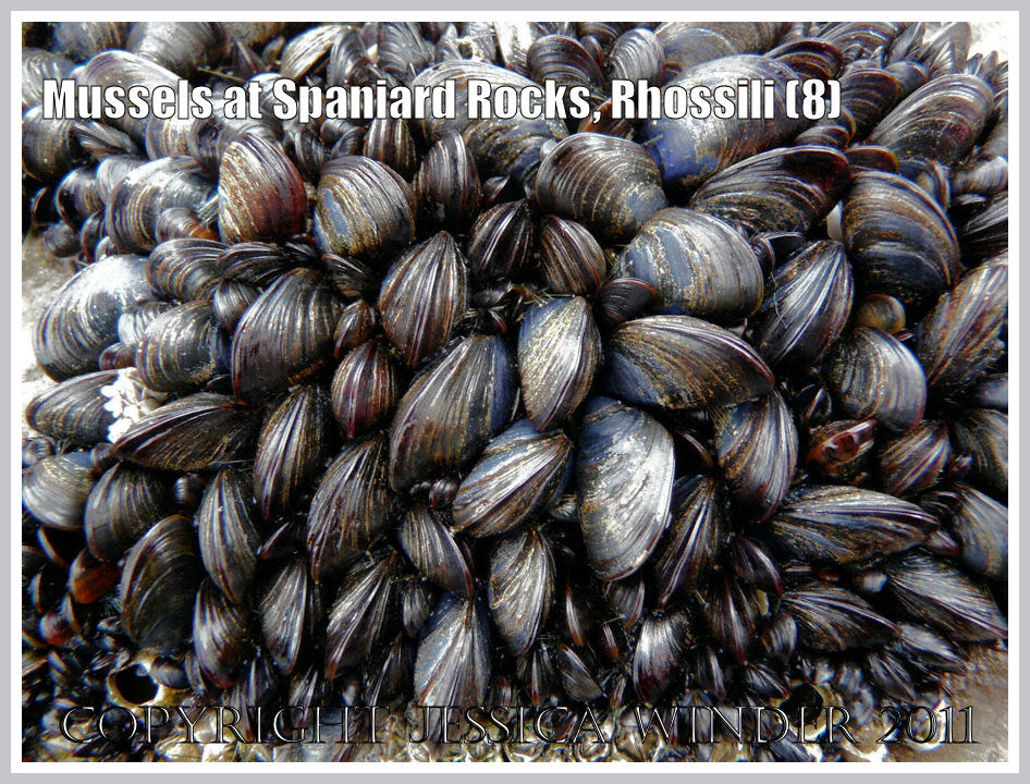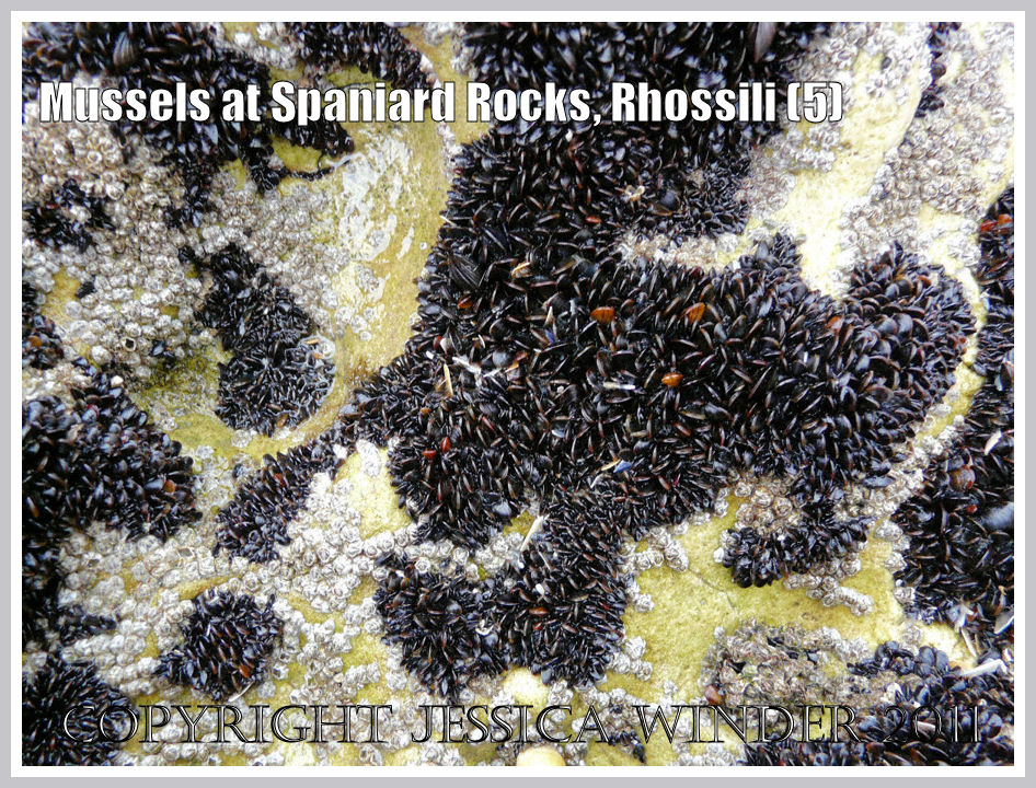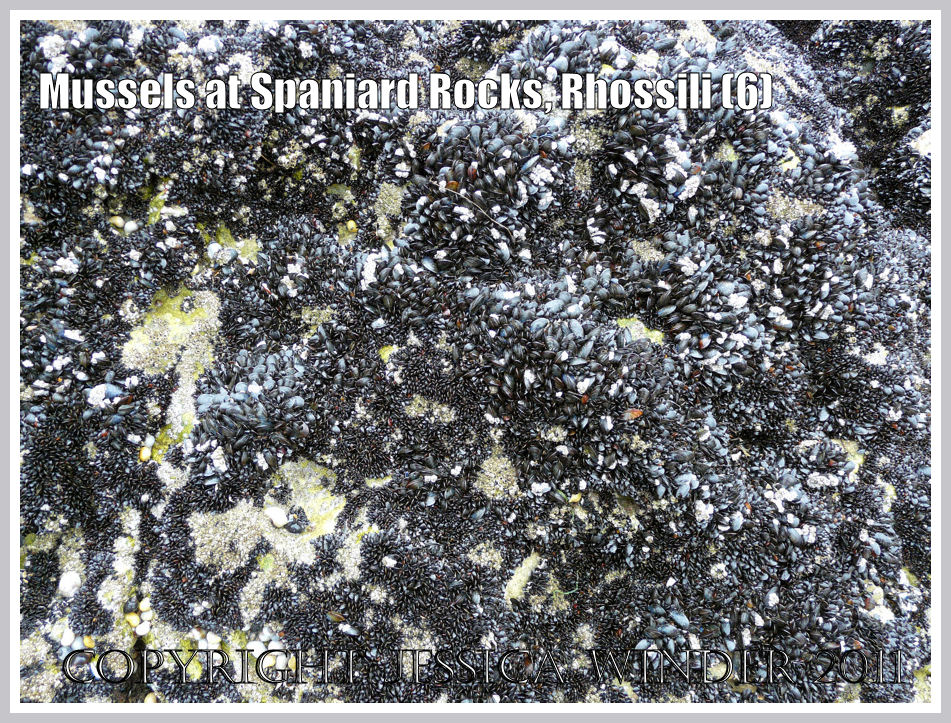The photographs show that the rocks are covered in several generations of mussels. You can tell this from the relative sizes. New seasons of young mussels prefer to settle and fix themselves by their fine byssus threads to surfaces where mussels already grow. Having said this, sometimes there are so many larval mussels that they settle on an incredible range of surfaces whether or not adult mussels are colonisers there. I have found hundreds of thousands of minute mussels attached to strands of green seaweeds round the corner from Rhossili in Broughton Bay.
