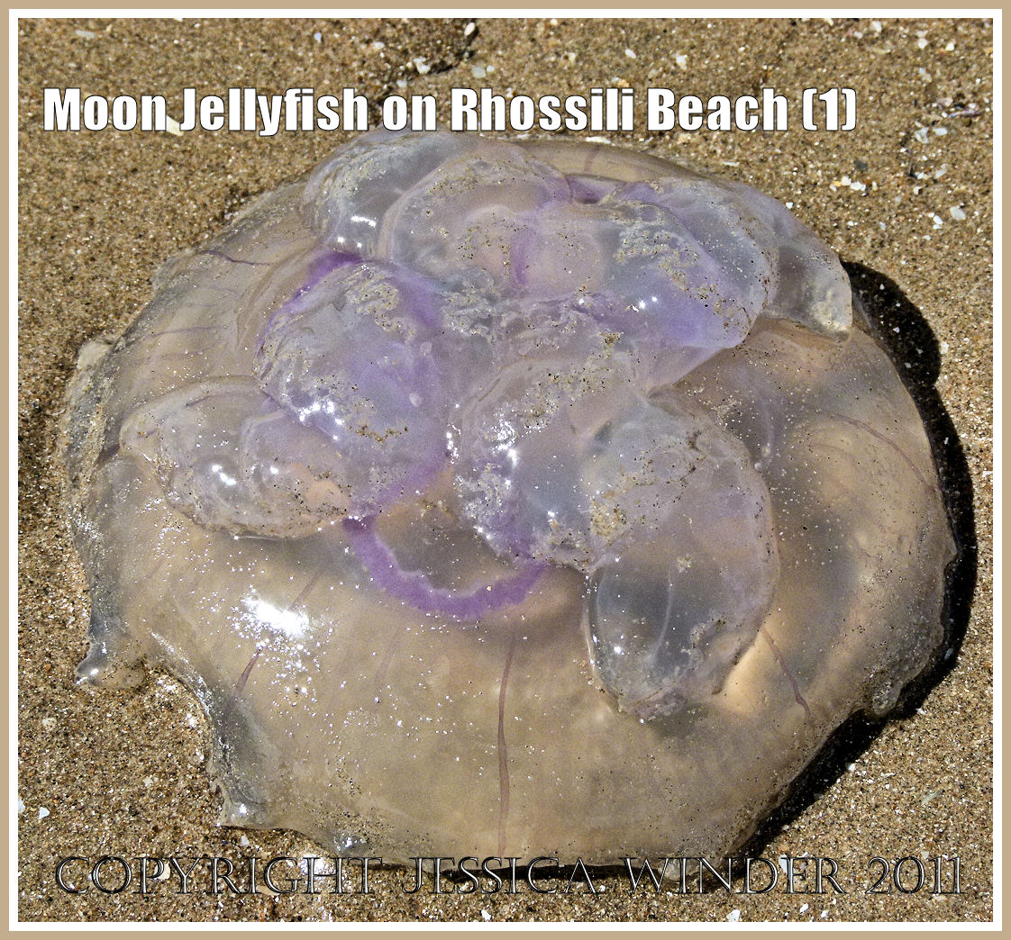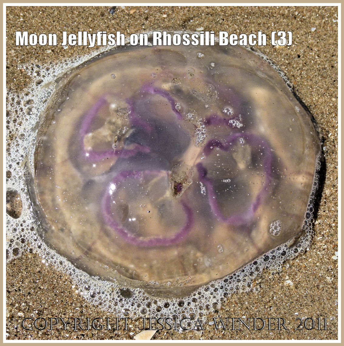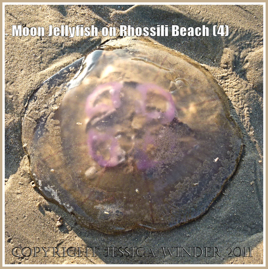 Moon Jellyfish – Aurelia aurita (Linnaeus) – were stranded on the sandy shores of Gower in larger numbers this summer than I can recall in previous years. They are most attractive with their characteristic four pink rings (gonads or reproductive parts) in the middle of the transparent jelly. They are generally fairly harmless (I think) regarding stinging if you touch them. They are quite difficult to photograph well because sand usually sticks to the gelatinous matter, and they dry out easily and tend to look dull. Many of their features are obscured or missing when you find specimens on the beach. Sandhoppers just love them and soon descend in hordes to nibble on them. Here are a few pictures I took this summer when Moon Jellyfish washed ashore in quantity on the beach at Rhossili.