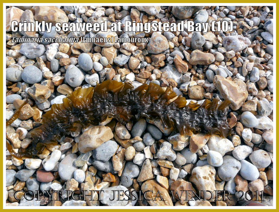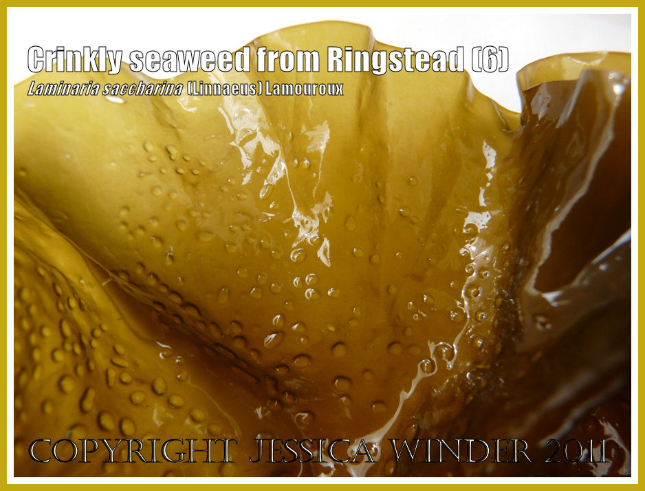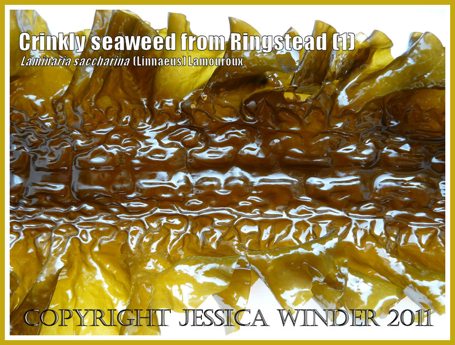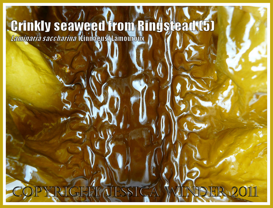 Sea Belt is a very common British seaweed. It is also known as the Poor Man’s Weatherglass because, if you hang it up crisp and dry, it will go limp in damp weather and forecast the rain. Its Latin name is Laminaria saccharina (Linnaeus) Lamouroux. This seaweed has the most wonderful glossy, crinkled, wrinkled, folded, and wavy flat fronds. The texture is mostly puckered like the fabric called seer-sucker. I have previously described this species in more detail in Kelps at Kimmeridge Bay and Three brown seaweeds from Studland Bay in spring.