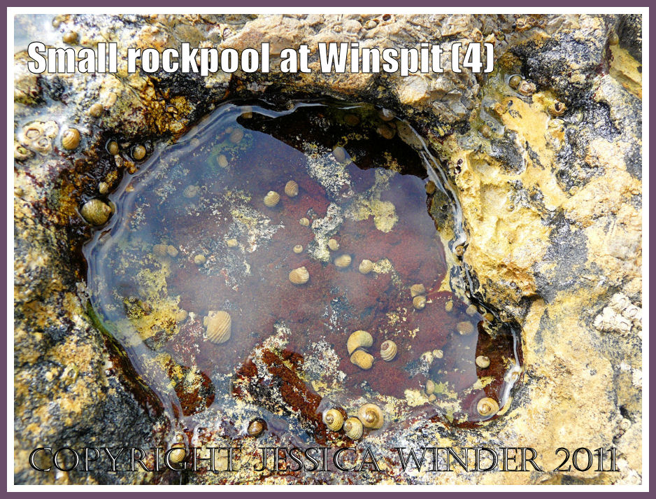 These are really remarkable rockpools and unlike any that I have seen before. The general surface of the rock in this location is covered with an almost continuous coating of encrusting calcareous algae. This is Lithamnion, usually pink or purplish, but in many areas here it is bleached-out and white. Patches of smooth black encrusting lichen, and microscopic green algae, are interspersed with the Lithamnion to form an irregular background patchwork of colour.