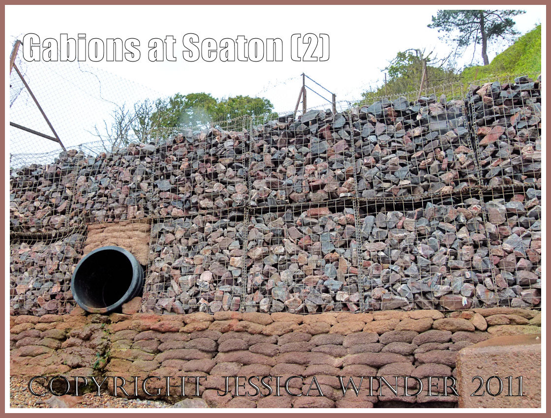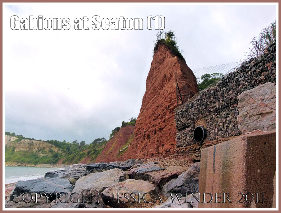 Assorted angular rock fragments from various sources fill the metal wire cages that comprise the sea defence gabions on the beach at Seaton in Devon, UK. The soft red Mercia Mudstone rocks of the cliff (top photograph) have been eroded back by wave action so that the steep pyramidal hill, that used to exist on the shore front, looks as if it has been neatly sliced down through the middle and the seaward half removed. The remaining portion is very precarious and vulnerable.
