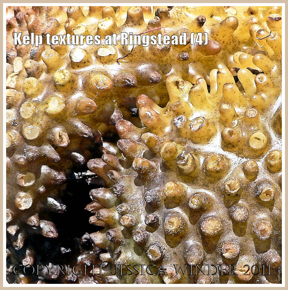 This third photograph shows one of many kelp fronds on the Ringstead shore that had completely lost their colour and opacity. The washed-up fronds were clear or tranlucent and seemed to both contain bubbles or capsules within the structure as well as to be covered on both upper and lower surfaces with droplets of rain water. The light was reflected by the shiny, smooth, wet surfaces. These fronds might be from either the Furbelows, or Tangleweed or Cuvie kelps – the isolated fronds or blades being indistinguishable to the casual observer.