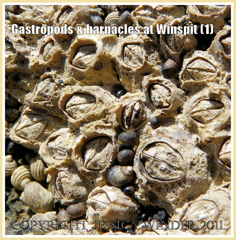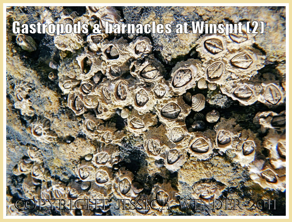 Small Periwinkle shells have a flat-sided spire and pointed apex. The main shell body whorl is black or brown but the colour is variable and light-hued specimens do occur. The surface of the shell is generally smooth but the body whorl may have spiral banding or vertical stripes. The whole shell measures no more than 9mm high by 7mm across and many are a lot smaller. These seashore creatures feed on detritus and black lichen. Black lichen can grow in very small patches on barnacle shells or as more extensive areas on the rocks. At Winspit in Dorset where these photographs were taken, the appearance of the barnacle shells has been altered by the presence of endo-lithic lichens so that they have many pits and lace-like sculpturings. The pits are the place where the fungus part of the lichen produces spores. It is possible to see these as small black dots in some of the pits.
