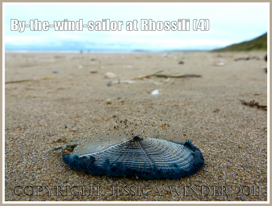 On a recent walk along the strandline at Rhossili, my eye was drawn to something small and very bright blue amongst the seaweed and debris. I thought at first it was a bit of plastic flotsam – but I was really surprised to discover, when I stooped to pick it up, that it was organic and jelly-like . Although it was a bit worse for wear, I could see that it was the remains of a By-the-wind-sailor, Velella velella (Linnaeus). There were several of these bright blue blobs washed-up on the sand.