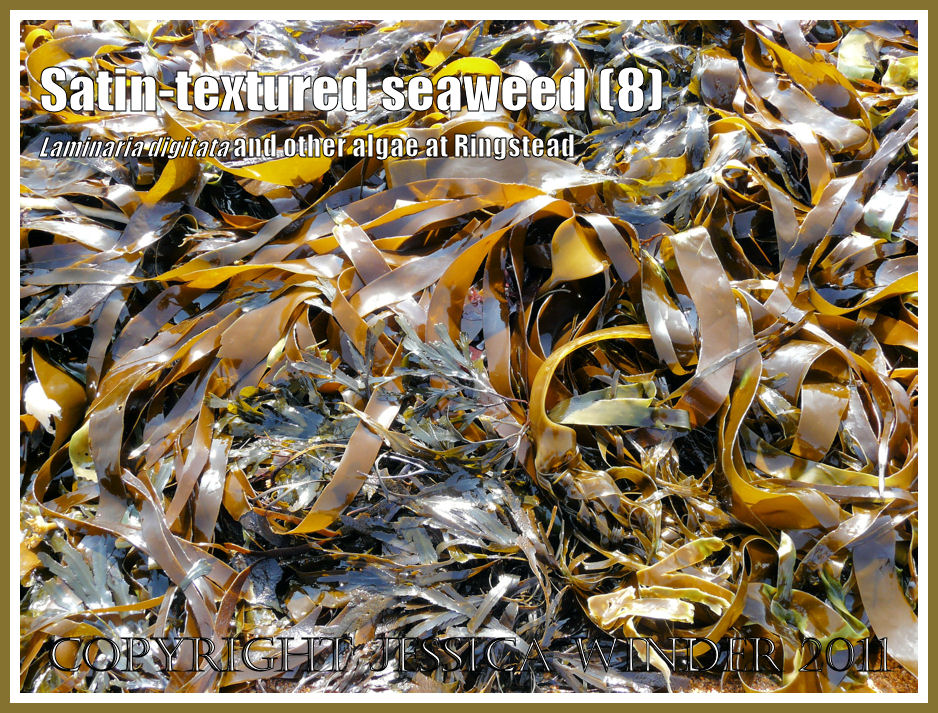 The kelp fronds feel like butter-soft leather and have a surface sheen like satin – gleaming or glistening according to how wet the straps were. The colours vary from a deep olive brown of drier blades, in the shade, or high and dry – to greeny yellow ochres of wetter fronds, part-submerged in water. Occasionally the kelp is decorated with intricate, fleeting patterns of golden reflected sunlight that dapples the fronds as they move gently in the lapping water.