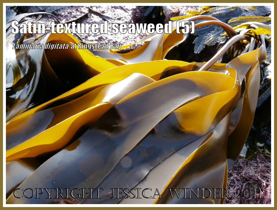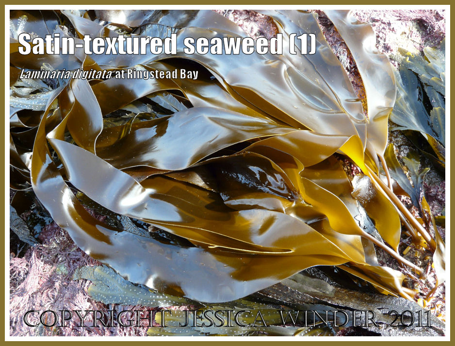 Kelp beds growing offshore at Ringstead Bay in Dorset are normally underwater but they are revealed at very low tides. A seaweed-covered rock platform, extending seawards from the beach, provides a precarious access to the exposed and partially submerged kelp of a type called Oarweed, or Tangle – Laminaria digitata (Hudson) Lamouroux.