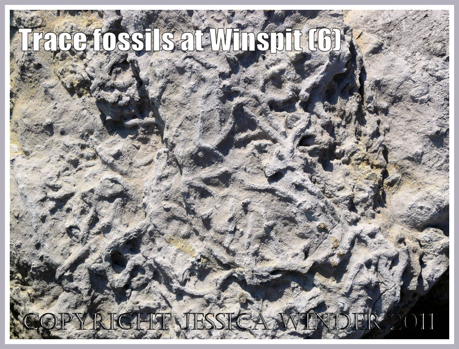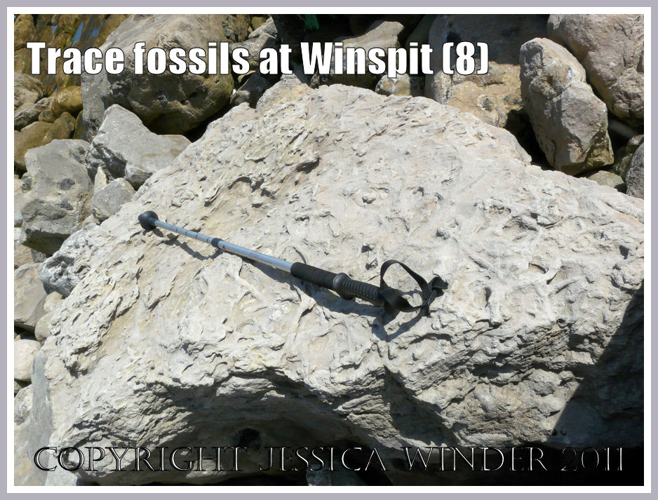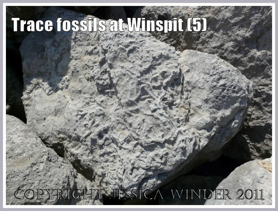 A pile of large angular boulders, between one and two metres across, rests on the rocky ledge at the foot of the cliffs where the valley meets the sea at Winspit. On the flat surfaces of some of the rocks are intricate patterns made up of horizontally branching networks of solid tubes about a centimetres or so in diameter. These are similar to the burrows made by decapod crustaceans (crabs) called Thalassinoides.