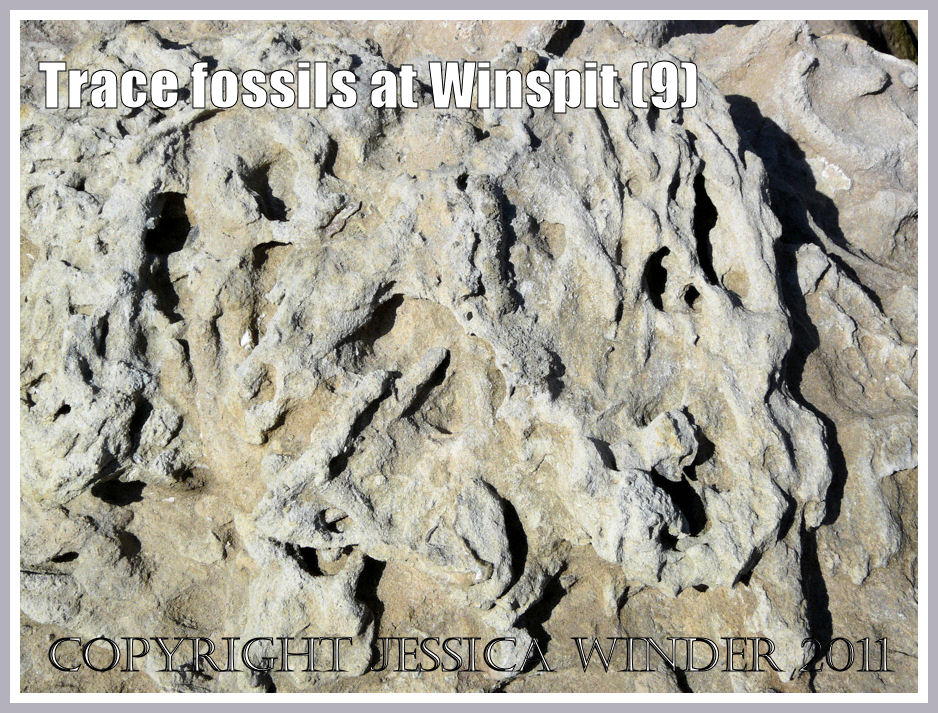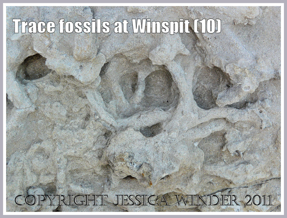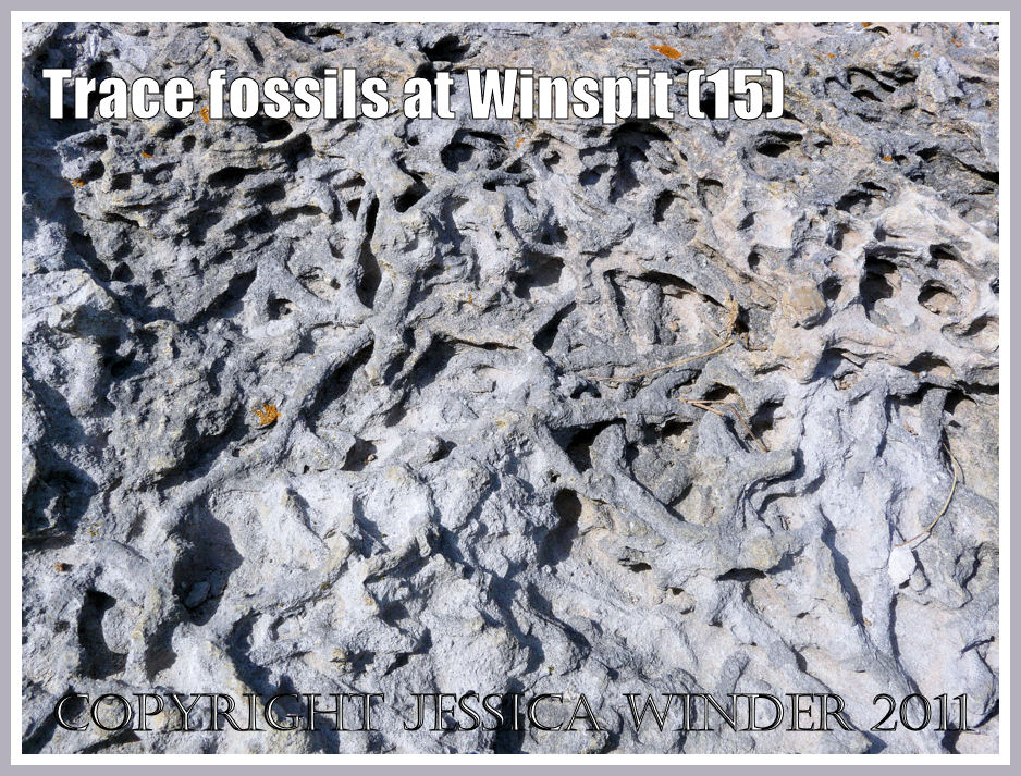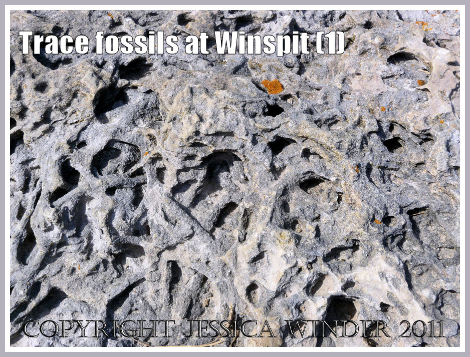 Trace fossils are geological records of biological activity. The rocks at Winspit in Dorset have preserved evidence of the burrowing habits of invertebrate animals that once lived in the soft wet sediments on the seabed and seashore of shallow seas over 135 million years ago in the Upper Jurassic period.