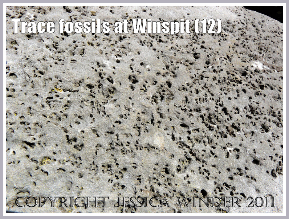 These trace fossils include burrows and tunnels made by crabs and worms. In some instances, the holes made by the creatures remain visible – as pictured in the first three photographs below. They look remarkably similar to the holes made by boring bivalved molluscs and by mud-tube dwelling marine polychaetes that occur in present day calcareous stones and mollusc shells (see the earlier posts on these subjects). As I am not a palaeontologist, I concede that this may not actually be a parallel causation – just a coincidence.