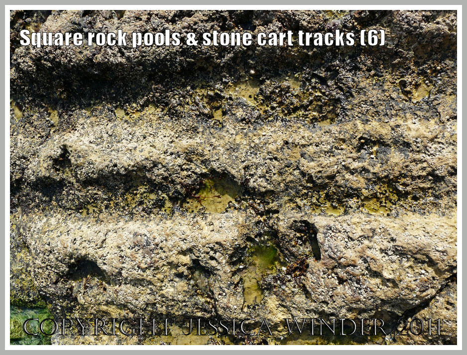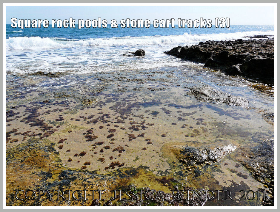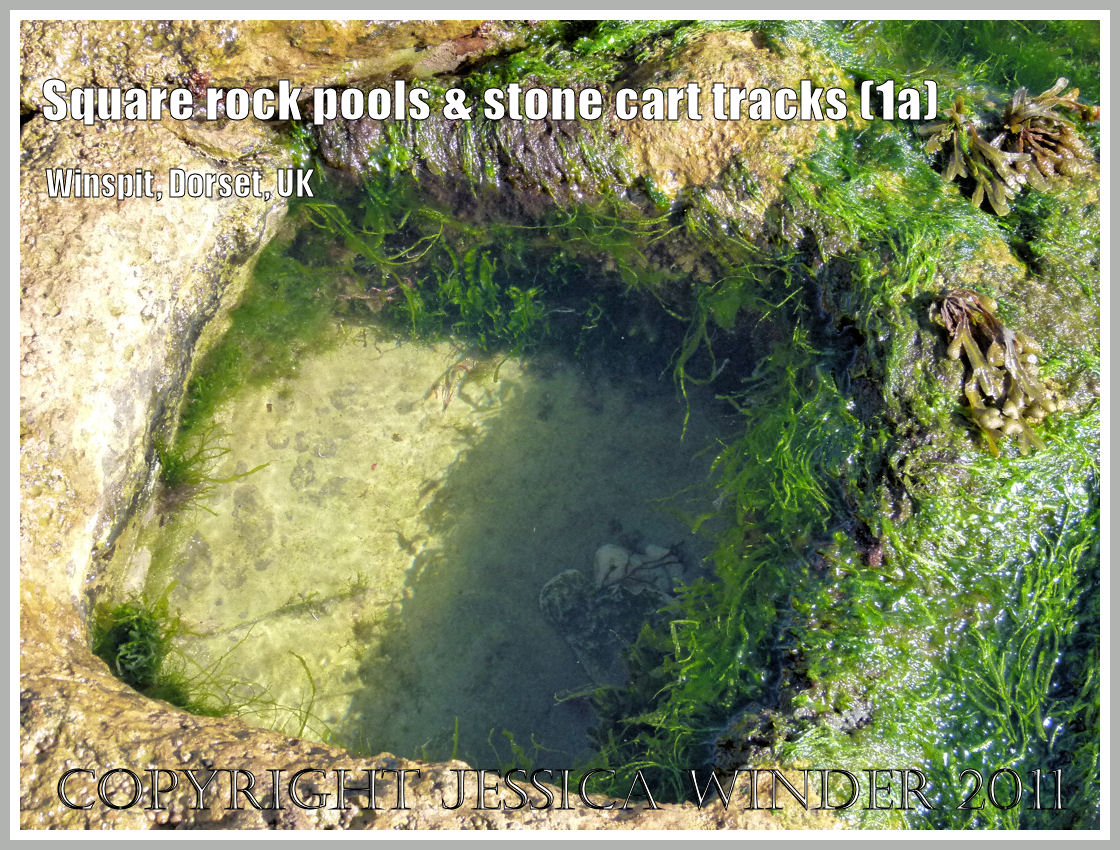 This really is a square rock pool. It is one of several to be found on the rock ledge at the foot of the cliffs at Winspit in Dorset. These square pools are scattered amongst the more usual and variously shaped pools on the rock ledge. All the pools are lined with a continuous coating of pink or bleached white calcareous algae. They are fringed with red Coral Weed or green Gutweed and provide a home to an assortment of gastropod molluscs and small fish.