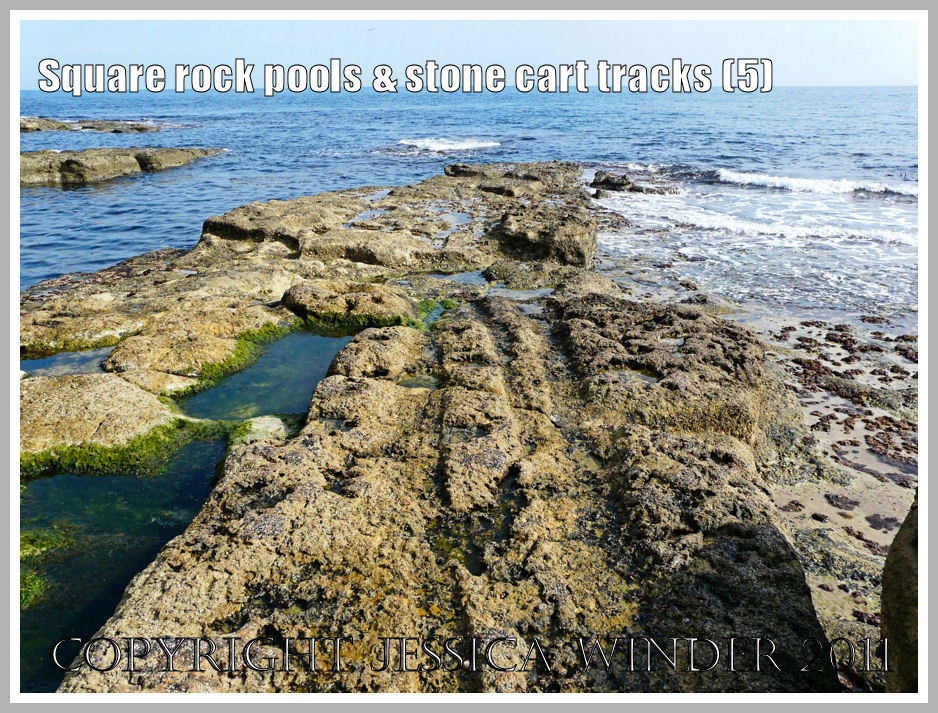 However, the square rock pools are man-made and provide evidence for the industrial history of the area. This is the site of a former quarry. The workings are mostly on the cliff top where you can still explore, with care, the cave like excavations. Large blocks of stone were at one time painstakingly hewn from the strata. The rock was too heavy to cart up the hill to the village. So cranes were constructed from old ships timbers and driftwood in order to lower the stone from the cliff top to the ‘beach’ below. Another set of cranes was built on the rock platform at the water’s edge to lower the stone into boats. The square pits were carved to hold the base of the main wooden post for these cranes.