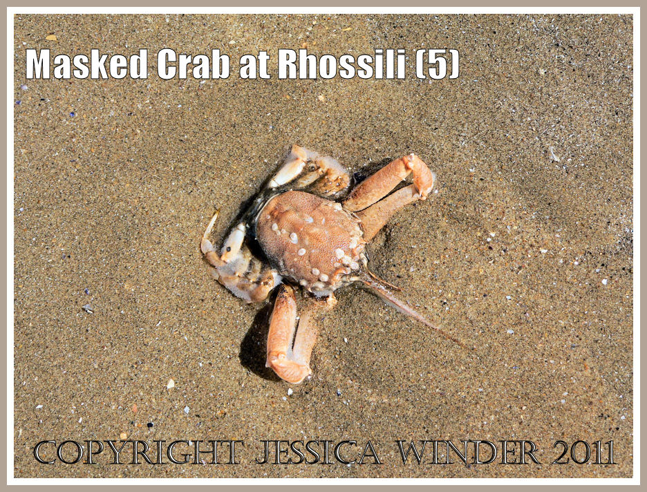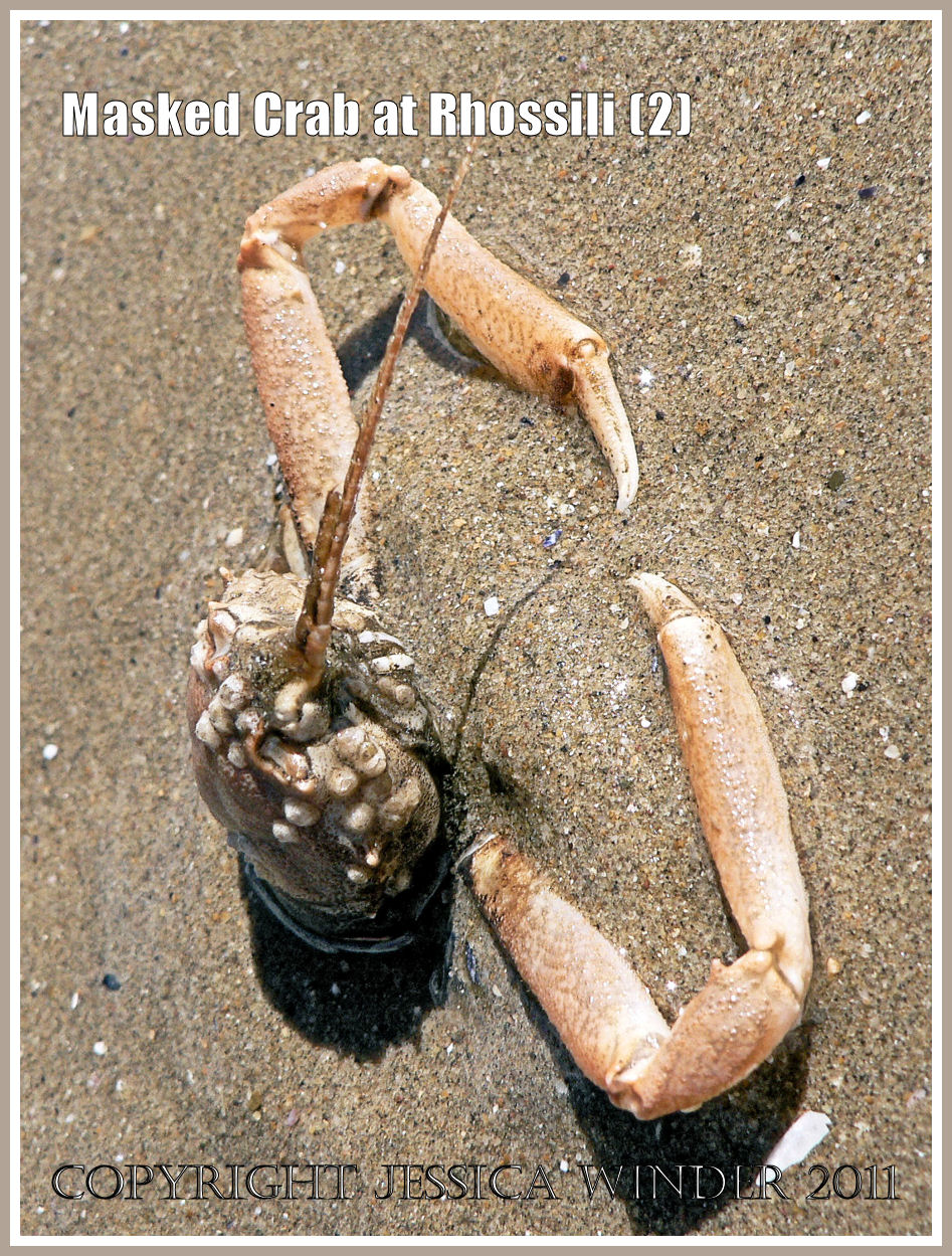 This living small male Masked Crab, Corystes cassivelaunus (Pennant), with a carapace no more than 39mm long, was sitting with its hind legs dug well into the wet sand to brace himself against the incoming waves. The chelipeds or front legs are twice as long as the body in the male crabs. As the crab holds these long limbs up in front of him, the sun seems to shine right through them. The two long antennae are held together to form a long tube which helps the crab breath when it is entirely buried in the sand.