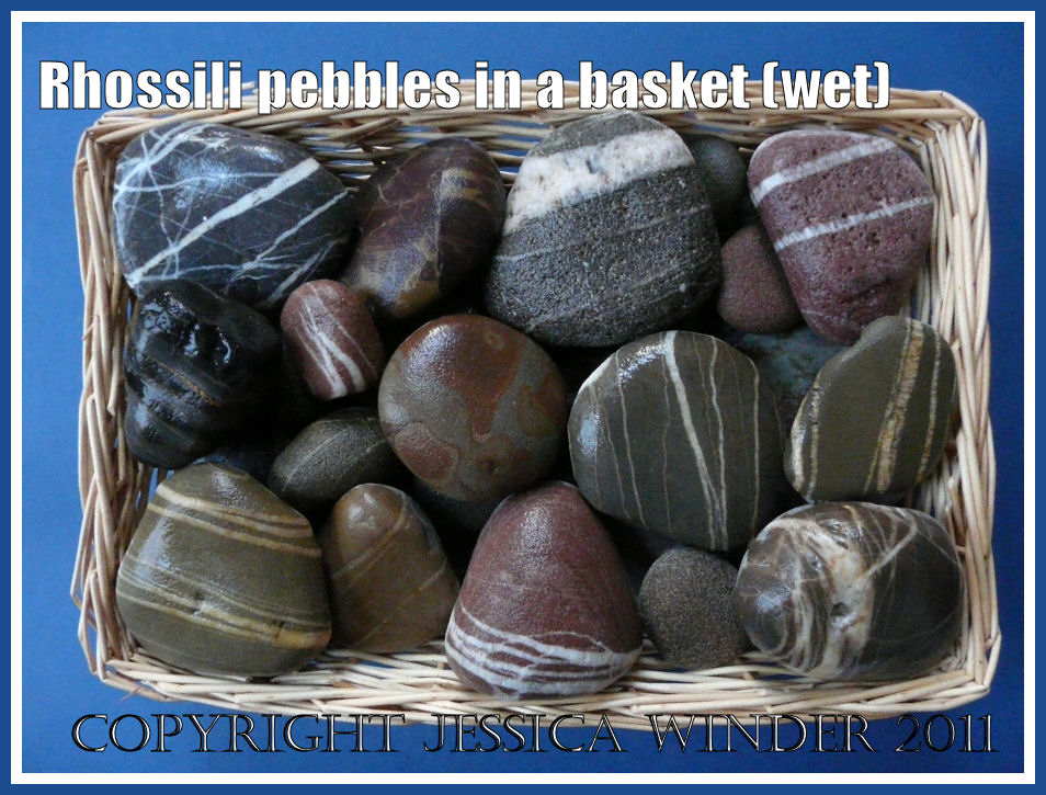 An assortment of pebbles found on the beach at Rhossili on the Gower Peninsula, showing the significant difference between the appearance of the pebbles when they are wet and when they are dry. This selection of pebbles contains varied rock types but I chose them for display because of their mostly striped markings.