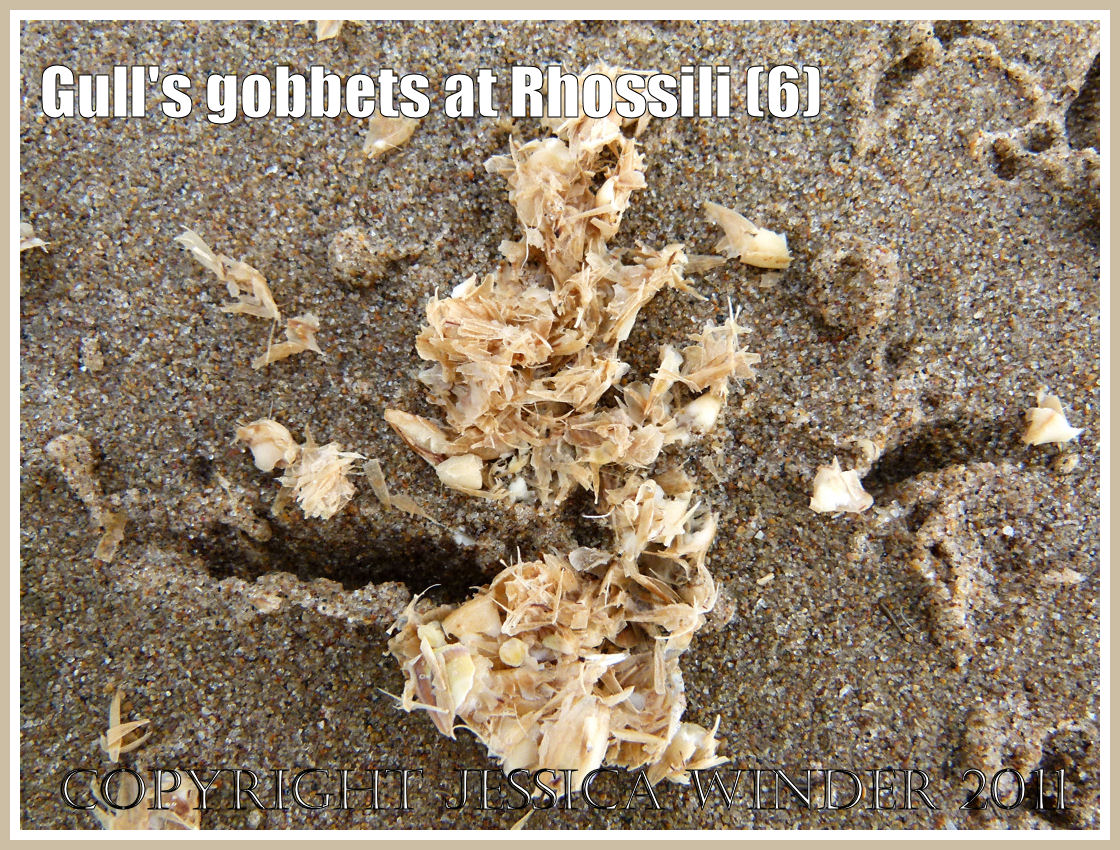 In photographs 4, 5 and 6 the gobbets are mostly made up of tiny pieces of the chitinous exoskeletons of small Crustaceans: probably including many Sandhoppers – Talitrus saltator (Montagu) – of which there must be millions on that beach. These shots were taken on 15th and 19th August 2011.
