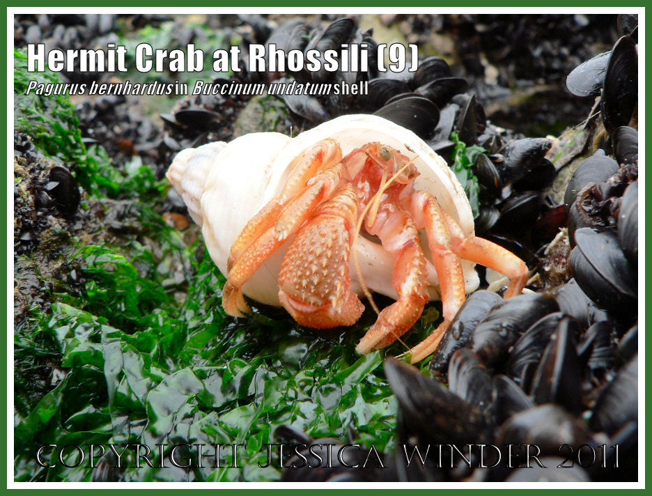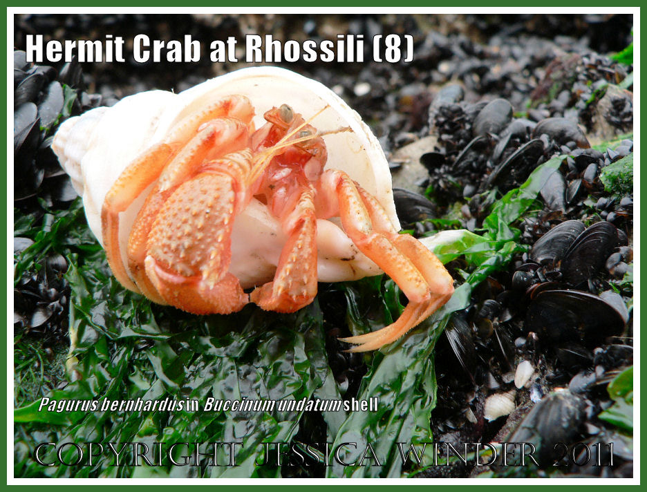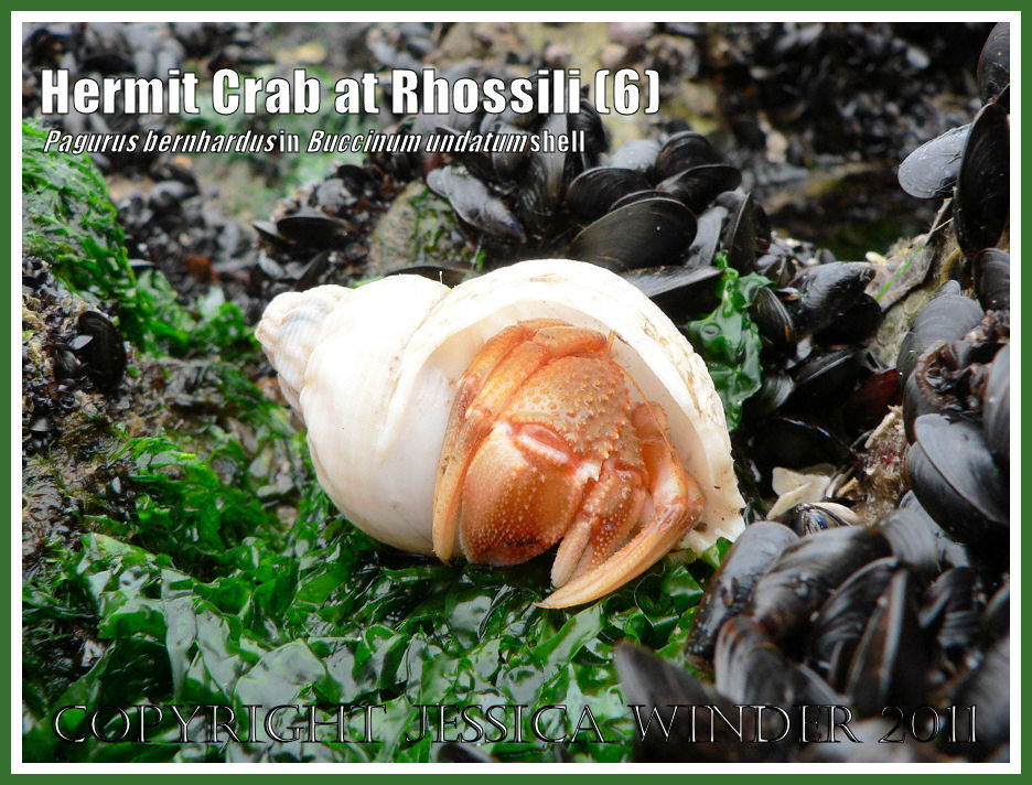 This sea shell has a secret. It is the new home of a Hermit Crab, Pagurus bernhardus (Linnaeus). He is very shy. I had to wait very patiently for him to come out of his shell – and then he nearly ran into the lens of the camera!