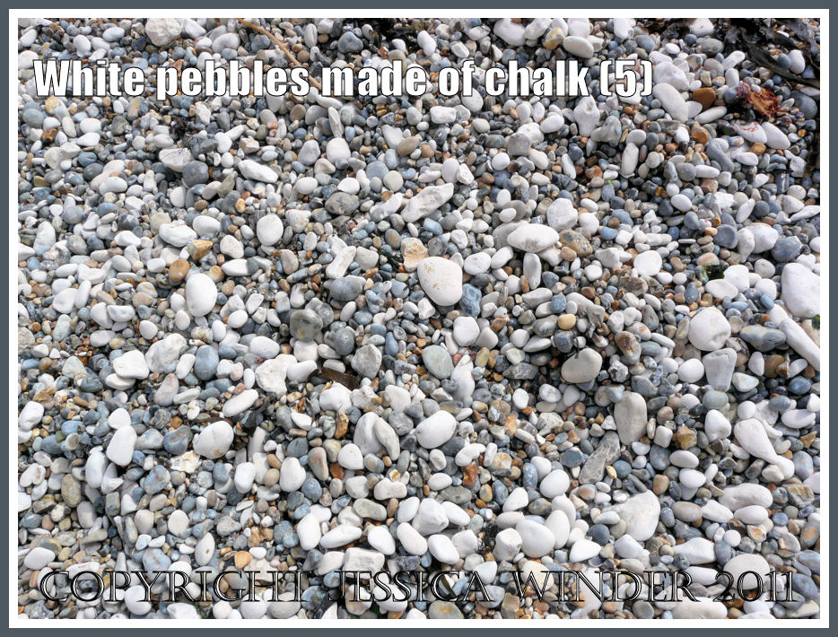 Chalk is one of several rocks from which white pebbles are made. Chalk is a Cretaceous rock and outcrops in many places along the seashores of the Jurassic Coast. The photographs show some arrangements of these chalk pebbles; and also illustrate how they look on the beach when naturally occurring. In the shore pictures, they are mixed with mostly grey flint and yellow chert pebbles against which the white pebbles contrast and stand out. The pebbles are shown at various magnifications and in both the wet and dry condition.