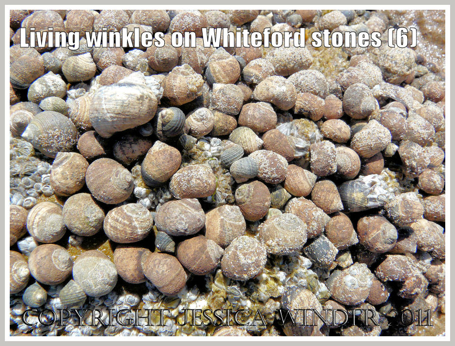 In common with these drifts of empty winkle shells on the strandline, the shells of these living specimens of gastropod mollusc are also thick and rough with a dull and worn surface. In close-up the shells also appear pitted; pitting can be caused by a lichen living in the matrix of the shell.