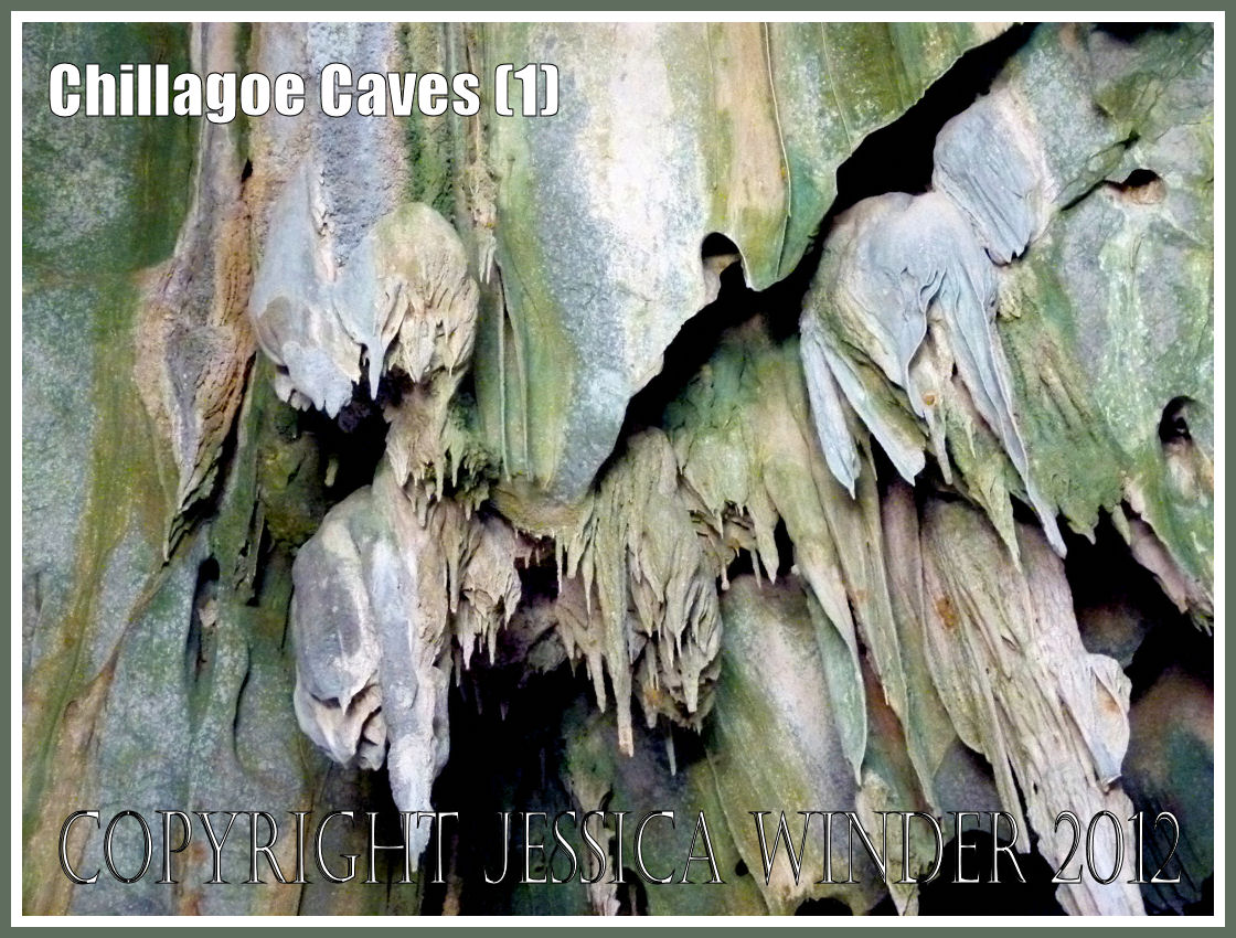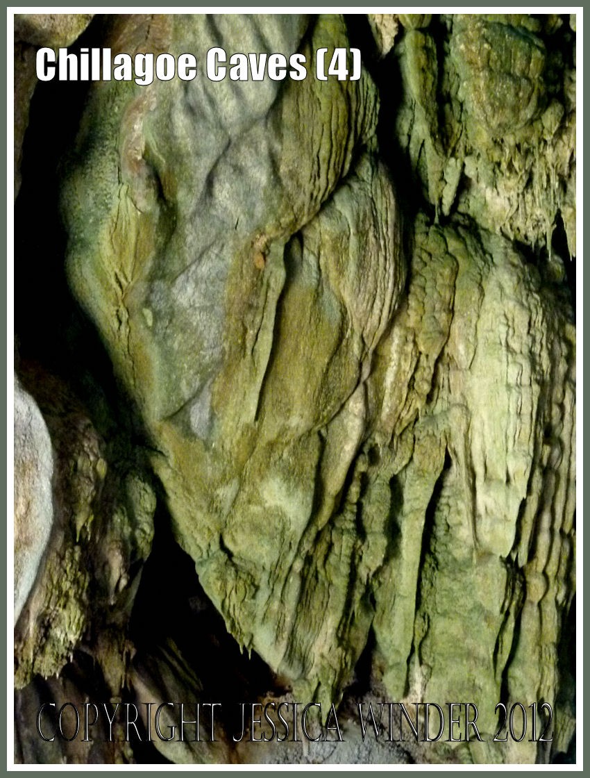 The photographs in this post illustrate some of the redeposited lime cave decorations. Stalactites form from the cave roof downwards. Stalagmites form on the floor and build upwards. Helictites form sideways. Shawls form draperies or bacon stone. Sometimes the lime deposits are sparkling calcite crystals. At other times knobbly formations with a chalky surface create what is known as cave coral.