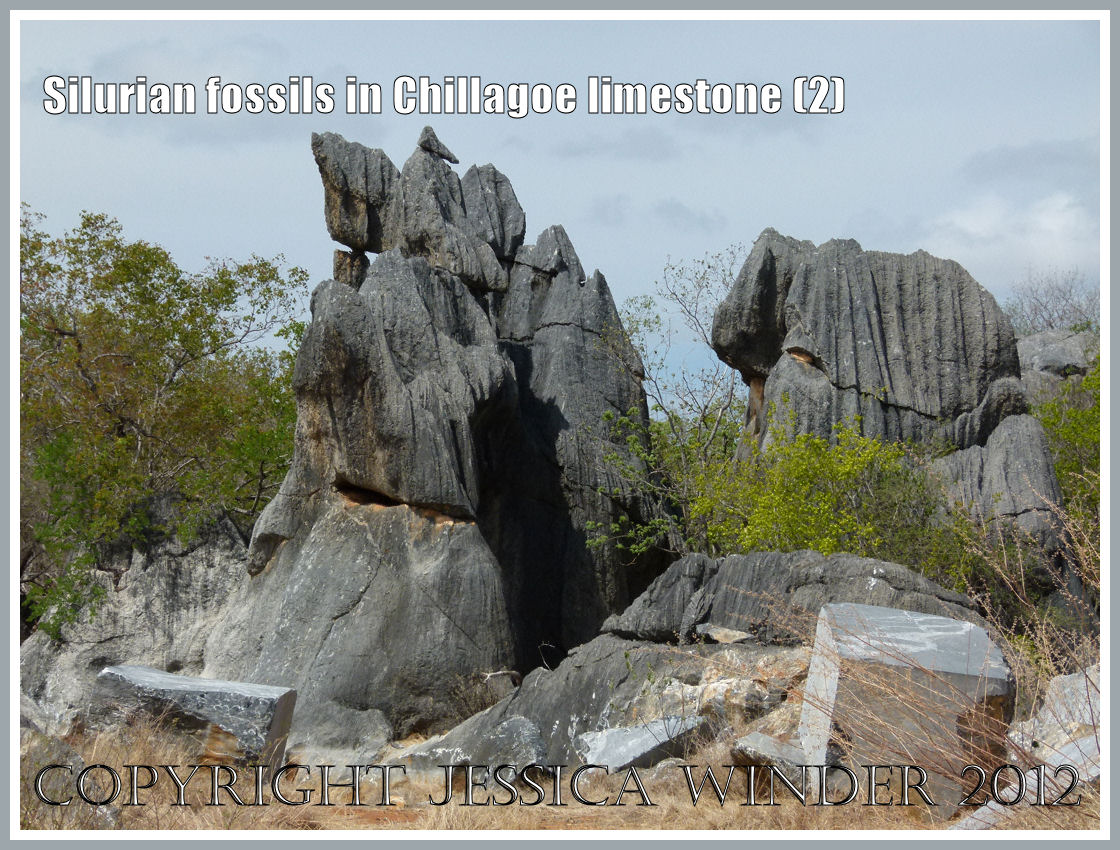 Fossil corals, brachiopods, bivalves, and crinoids, from ancient seas 400 million years ago, survive in the limestone of the Chillagoe District, Queensland, Australia. An abundance of these Silurian marine invertebrate fossils are preserved in the rocky outcrops in the area and easy to spot. You can see them on the natural rough surfaces of the cliff-like sides to the karst towers or bluffs. You can also see them in the cut sections of adjacent boulders where the marble quarrymen have been exploring the commercial potential of new sites.