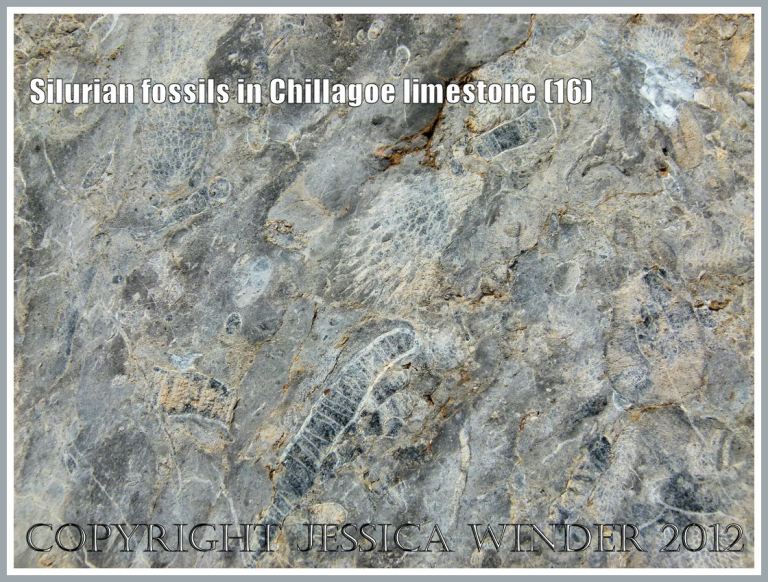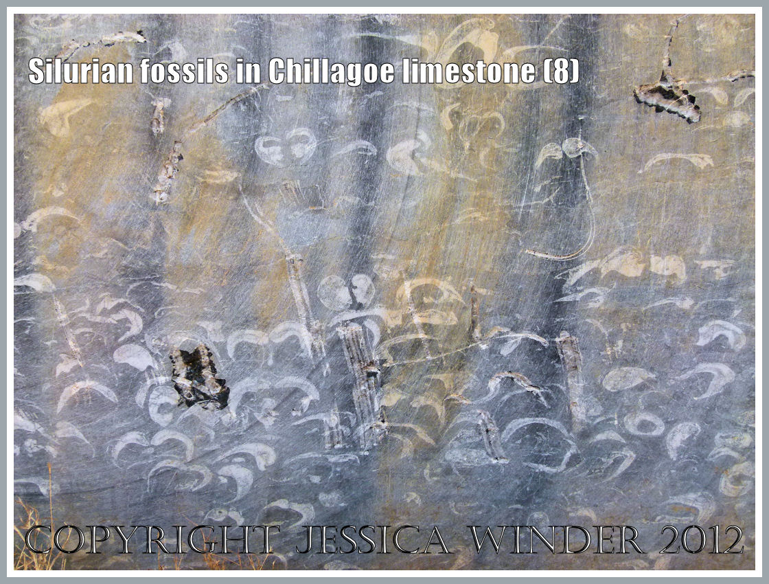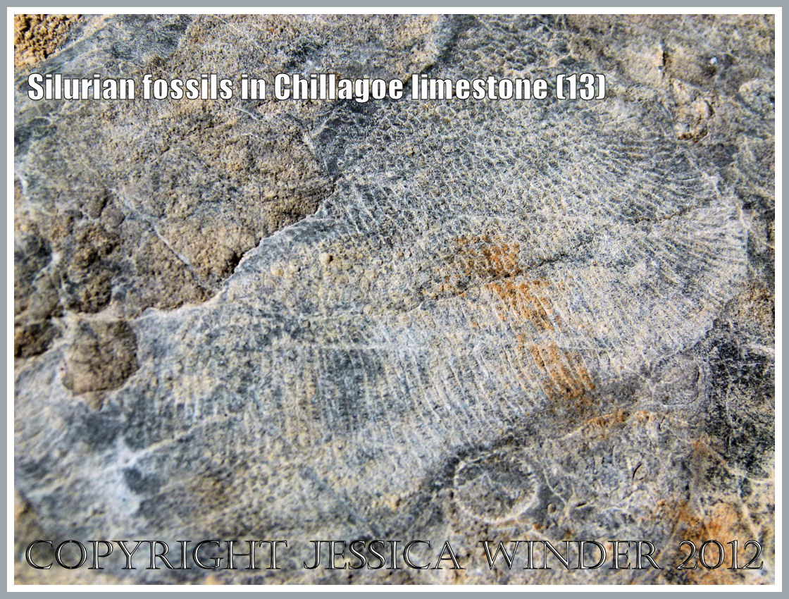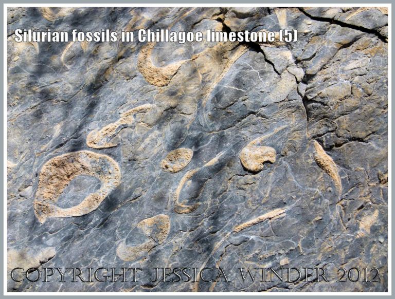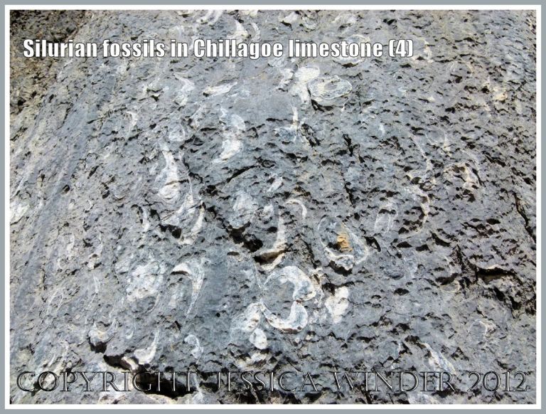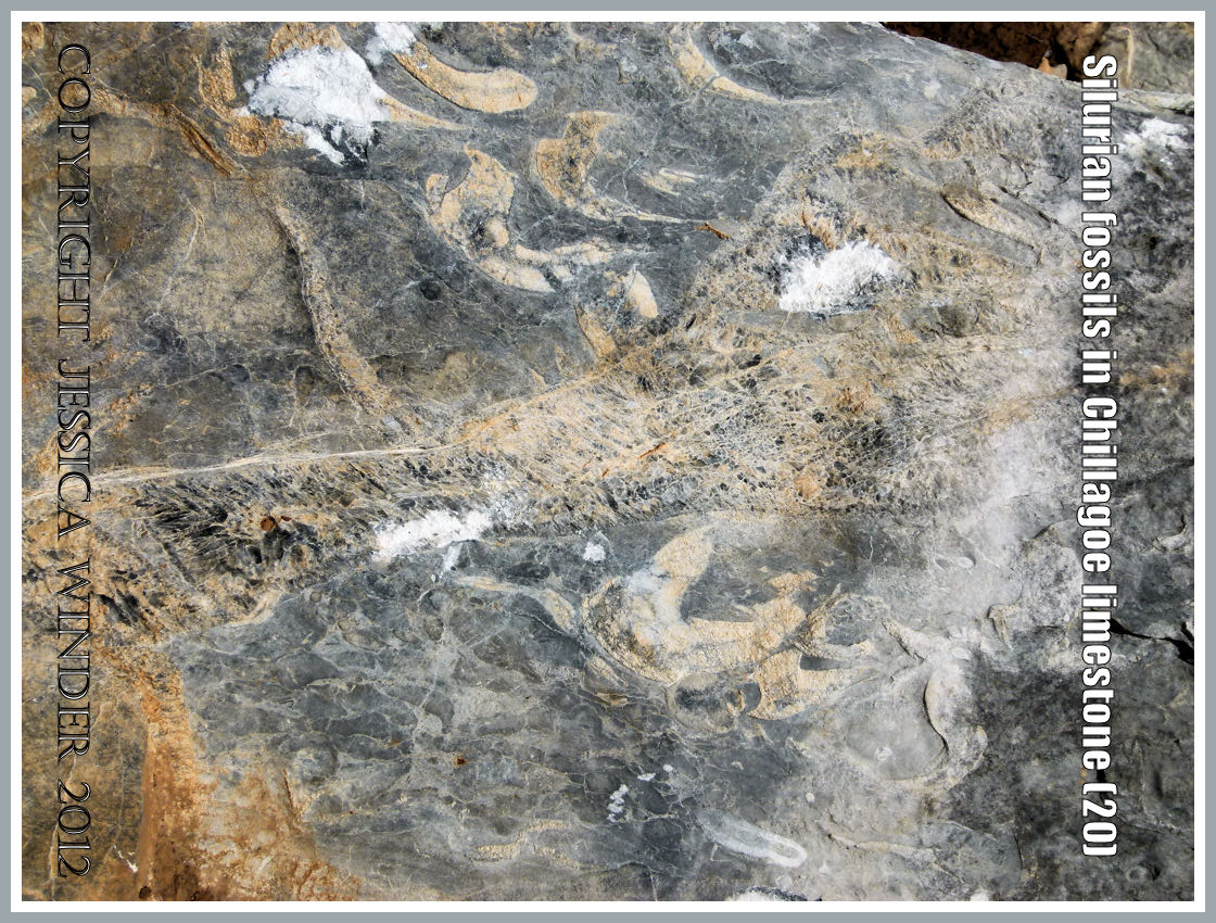 Large bivalved mollusc shells, some still joined together in the pair, were the most numerous fossils – and there were many brachiopods as well. These occurred as distinct shelly layers in the way they had been deposited in the sea-bed sediments so long ago. However, major upheavals and folding of the compacted deposits during later geological periods has resulted in these layers of fossils being re-oriented from the original horizontal to an almost vertical alignment.
