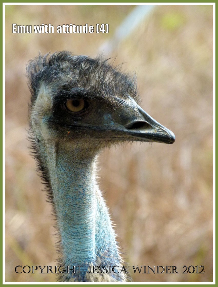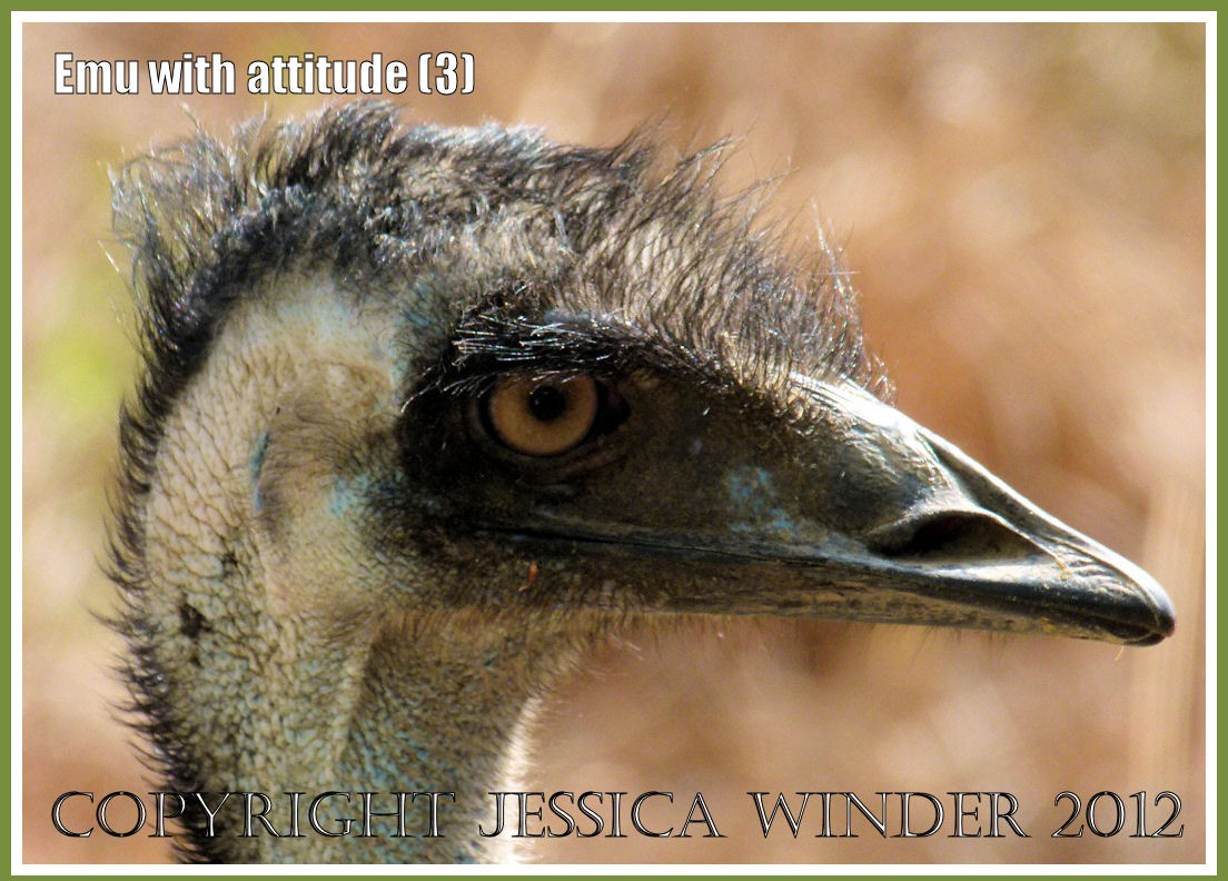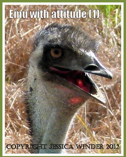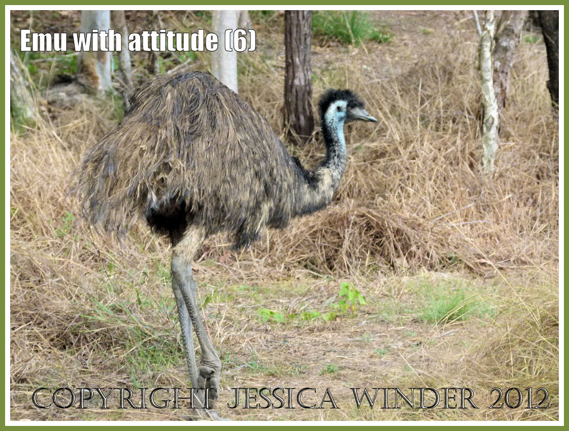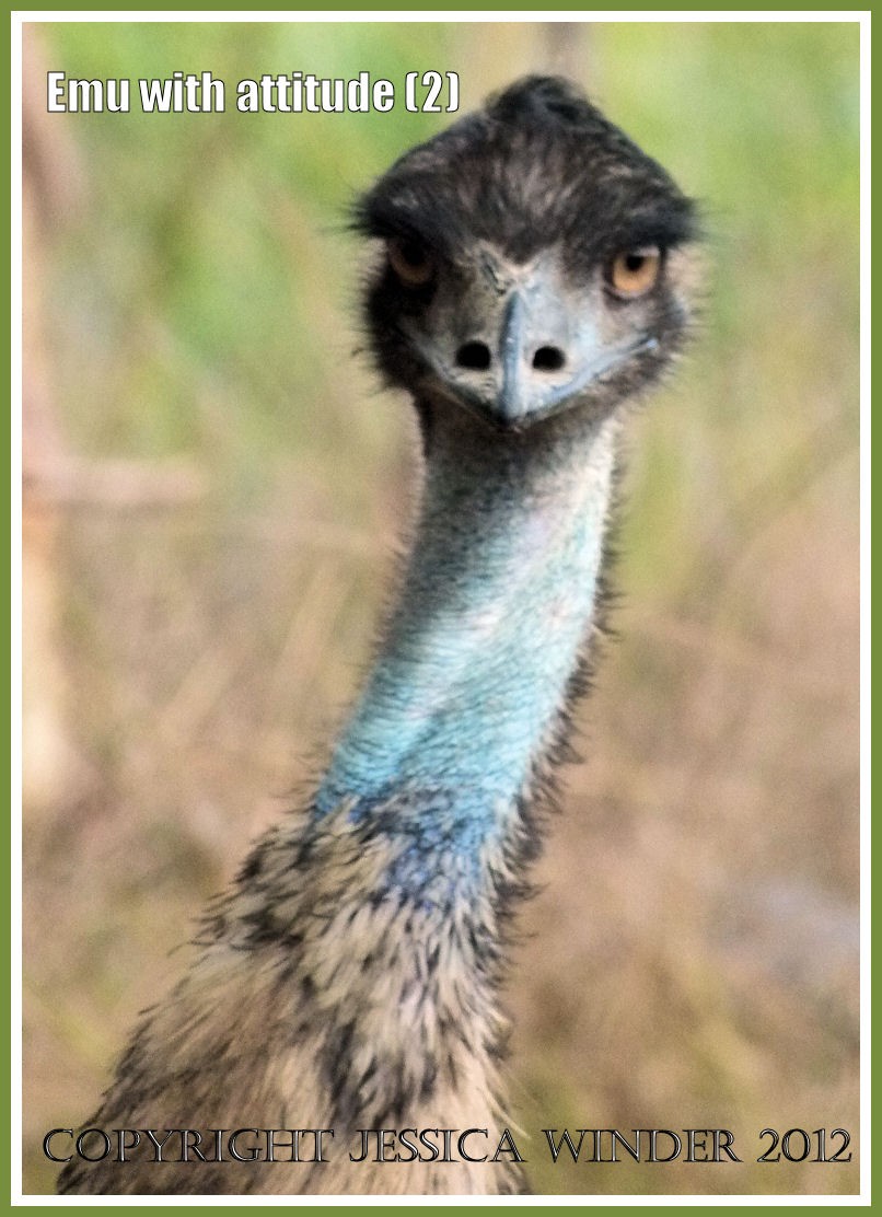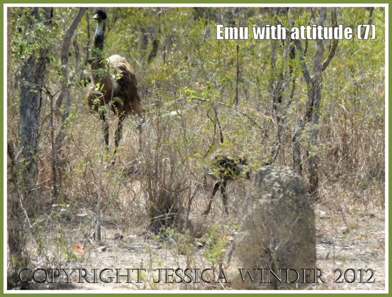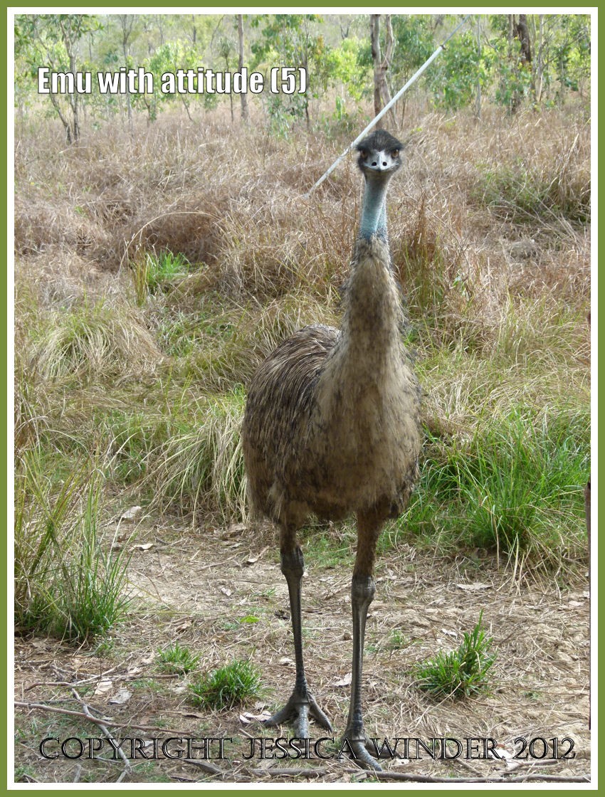 This Emu sighted at Mareeba Wetlands in Queensland, Australia, was definitely a bird with attitude. It walked towards me with a menacing eye as I stood poised with the camera but, true to genuine naturalist spirit, I continued to take shots until the bird felt it had intimidated me enough and hurried back into the bush where the emu chicks were hiding.