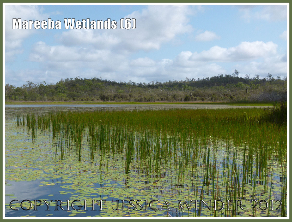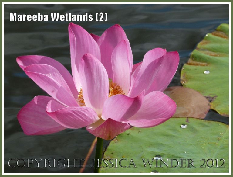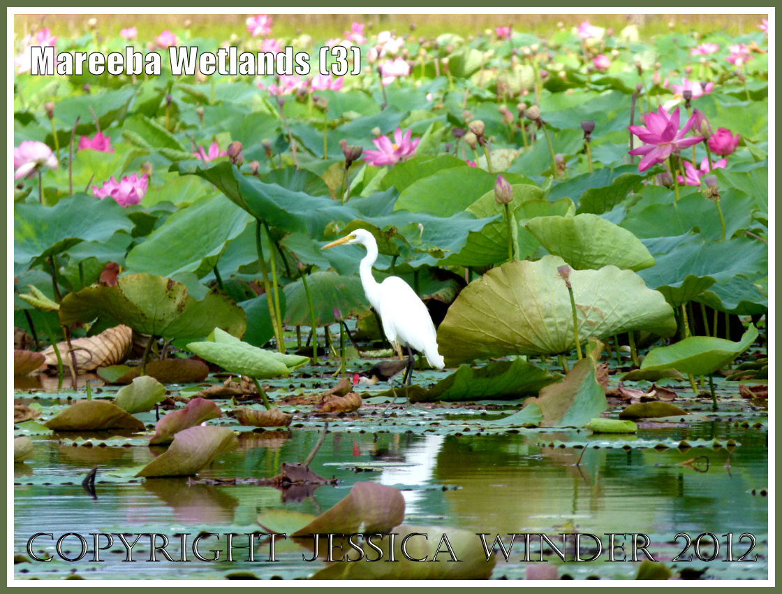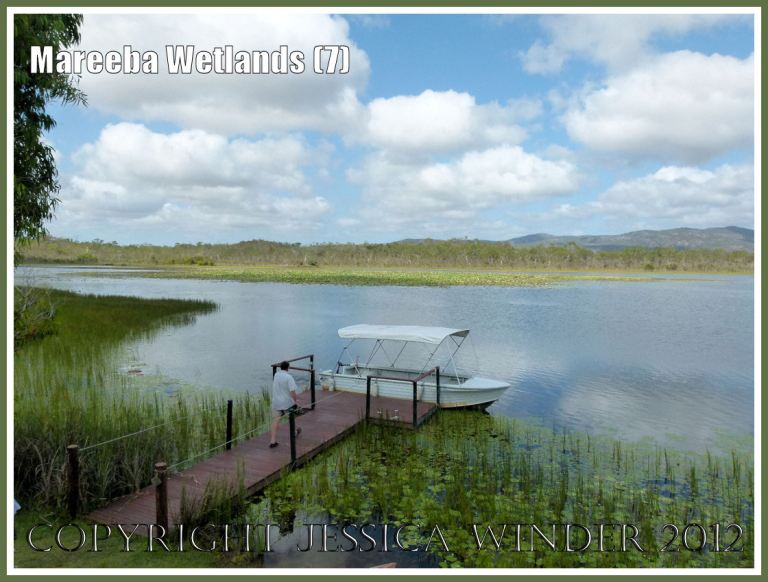 The Mareeba Wetlands are a gorgeous sight with vast beds of reeds and pink lily flowers fringing a lake populated by water-loving birds that include white egrets and darters.