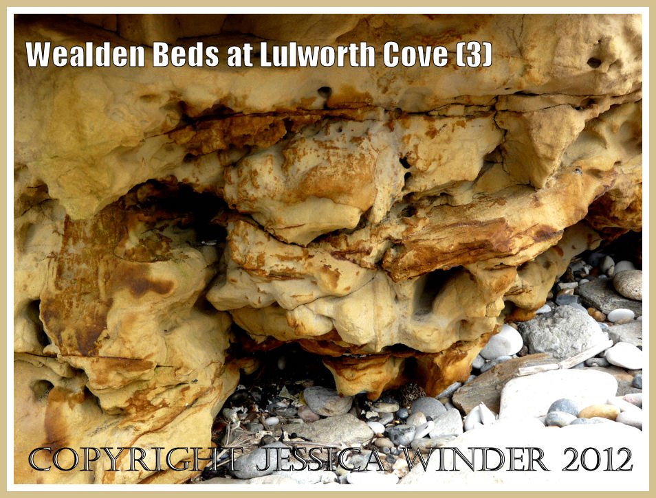 Although this World Heritage Site is called the Jurassic Coast, it includes earlier Cretaceous rocks as well. The Greensand, Chalk and Wealden Beds all belong to the Cretaceous period. The photograph above shows the soft sandstone layers at the base of the cliff that are being worn back and undercut by the sea.