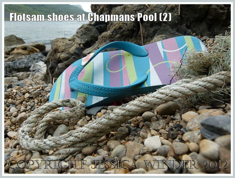 Here are some photographs of trainers, flip flops, and sandals that I found on the beach at Chapmans Pool last weekend. It always makes me wonder how the owners walked home after losing their shoes – no mean feat (or should I say ‘feet’) to climb up the hill again barefoot after the trip to the beach!