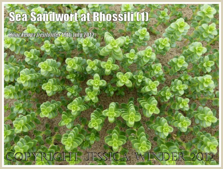 Sea Sandwort, Honckenya peploides, is a small, low-growing, fairly fleshy plant that lives on the upper beach where it forms a rapidly spreading carpet of vegetation by means of an extensive stolon system beneath the surface of the sediments. Sea Sandwort frequently grows where strand-line debris has trapped drifting sand. When Sea Sandwort plants colonise this habitat, they impede and hold even more drifting sand particles amongst their leaves, stems, and root systems. These plants can therefore be important pioneers that help to stabilise the foreshore and act as a precursor to the formation of dune systems.