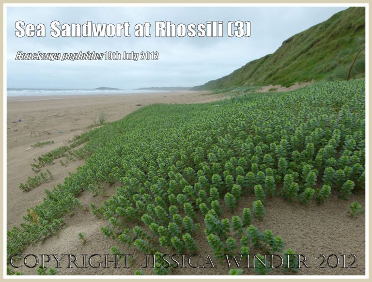 You could see this happening on Rhossili beach in July this year. The first three photographs in this posting show a colony of Sea Sandwort growing well on an accumulation of sand near the top of the shore close to the solifluction terrace escarpment at the base of Rhossili Down. This species was one of several pioneering plant communities acting as sand stabilisers along the length of the beach.