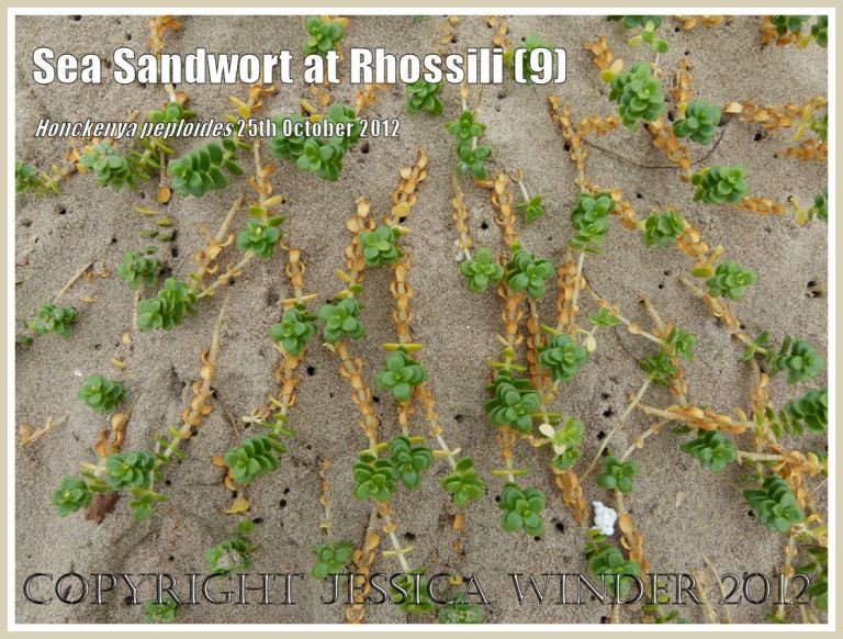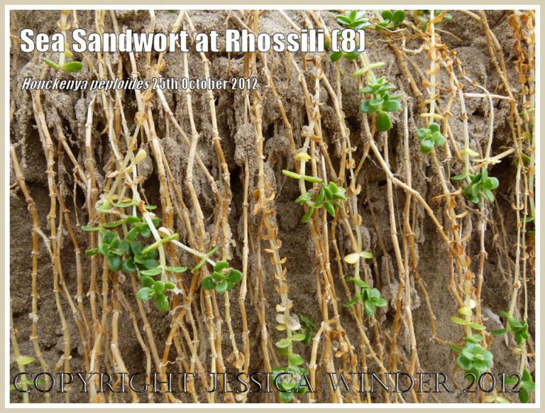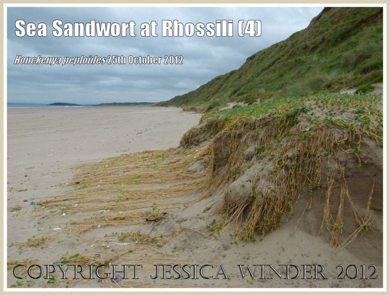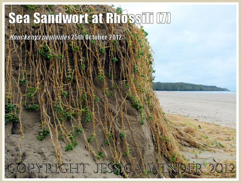 However, by late October this year, these plant colonies had either been severely damaged or eradicated totally. Using the Sea Sandwort as an example, it is possible to compare the July pictures with the October ones of the same plant stand, and to see how the mound of sand on which the plants were living has been largely removed. It is likely that the extreme high tides around 16th October 2012 (predicted height of 10.14 metres above Chart Datum at Mumbles), driven by strong onshore winds, washed the sand away. The seaward edge of the mound has been truncated to form a low cliff-like face. Many of the plant stems and roots are now exposed to the air, hanging like a curtain over the vertical edge of the remaining block of sand, or draped like streamers over the flat surface of the shore.