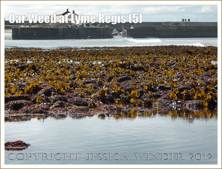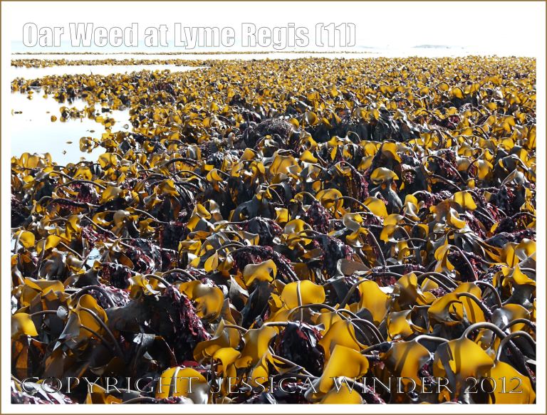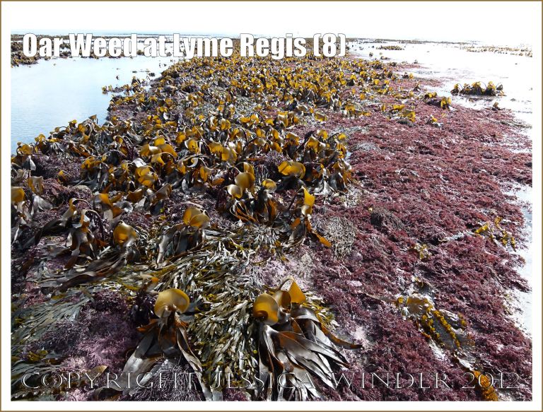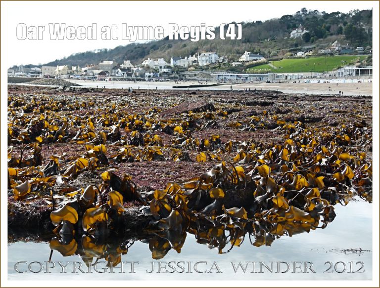 On a visit to Lyme Regis in March 2012, I was delighted to witness acre upon acre of glistening kelp beds as they were gradually uncovered by the receding tide. It was a particularly low tide that day. The seaweed beds that are usually under water were gradually revealed. The algae are attached to wide rock platforms that extend seawards from the base of the cliffs.