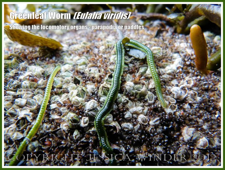 A fairly decent photograph of the marine polychaete Greenleaf Worm (Eulalia viridis) in which you can see the rows of paddles along each side of the animal attached to each separate segment of the body.
