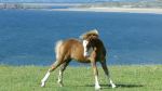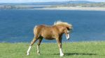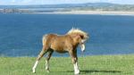 A Gower pony foal on the windy cliff-top at Rhossili Bay, overlooking the wide sandy beach on a sunny day, with Burry Holms island on the horizon.
