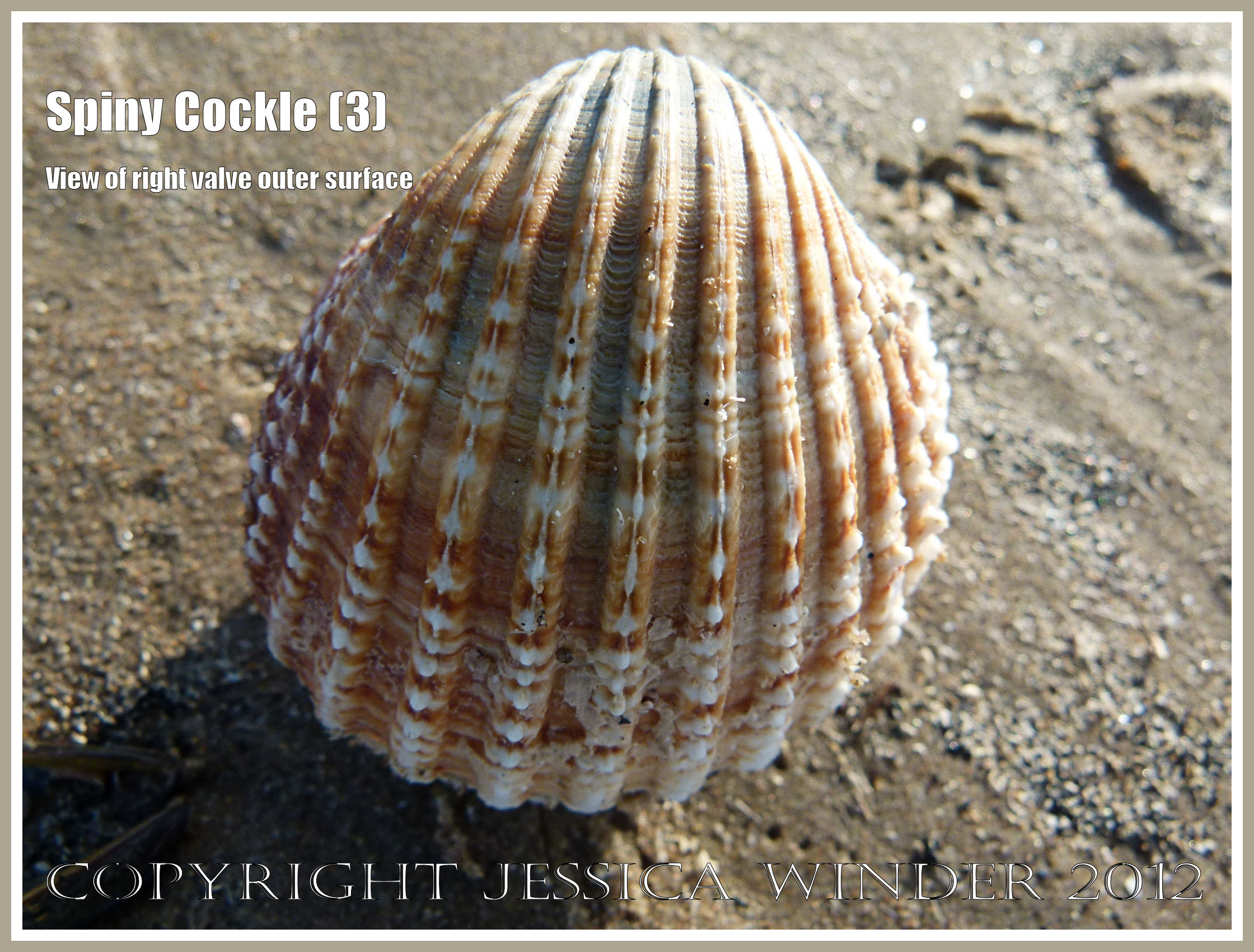 Spiny cockle (3) – View of the right valve outer surface Acanthocardia aculeata L. showing outline shape, radiating ribs, and spines joined by a continuous ridge along each of the ribs. Rhossili Bay, Gower, South Wales. P1290152aBlog3