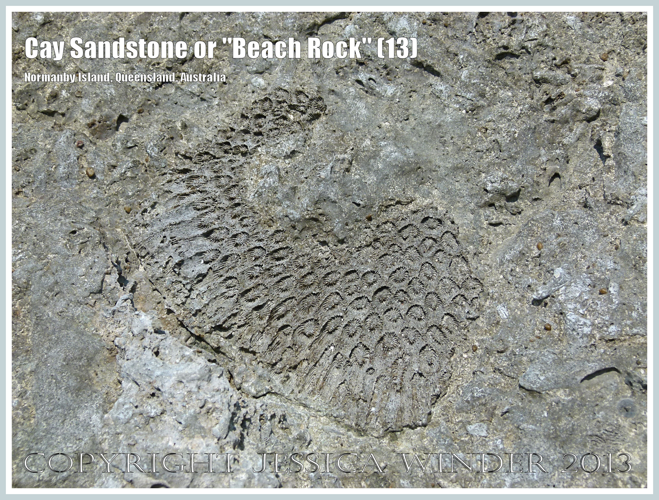 Cay Sandstone or “Beach Rock” (13) – Impression of a coral in recently formed Cay Sandstone or “Beach Rock” on Normanby Island, Queensland, Australia, part of the Frankland Islands group. P1180651aBlog13