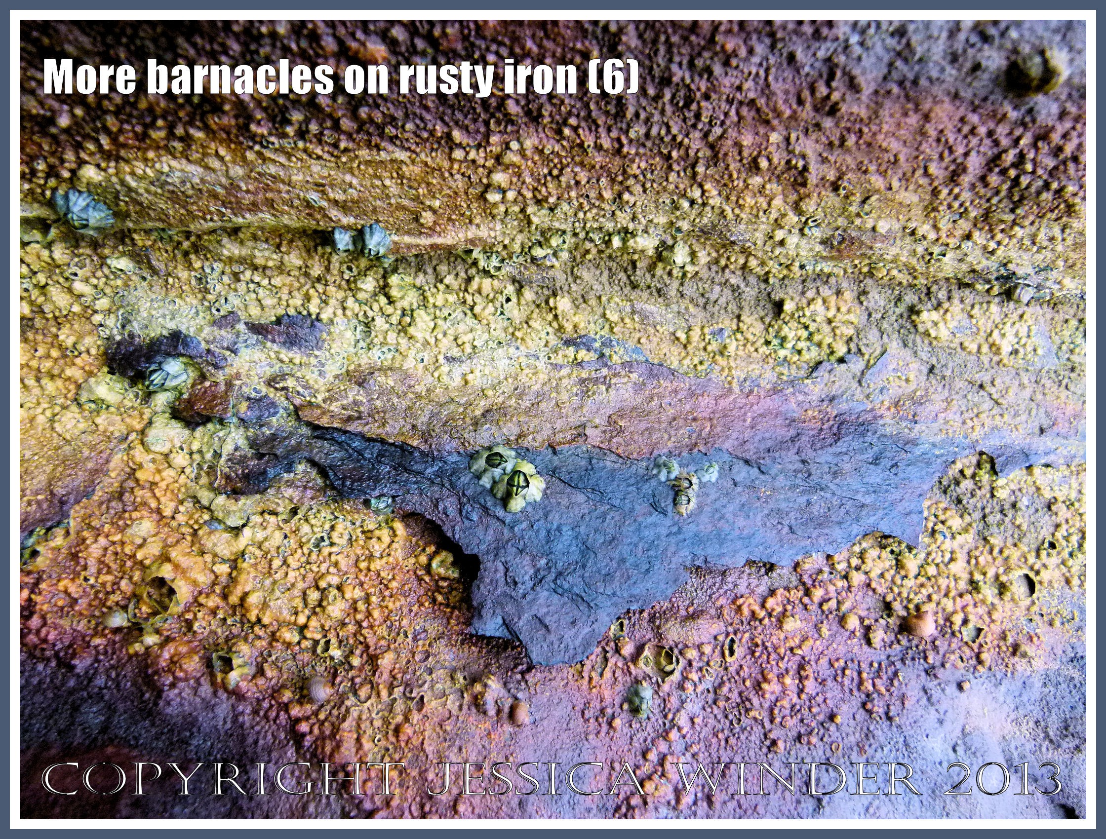 More barnacles on rusty iron (6) – Acorn or sessile barnacles living on an iron seaside pier corroded by sea water. P1300349aBlog6