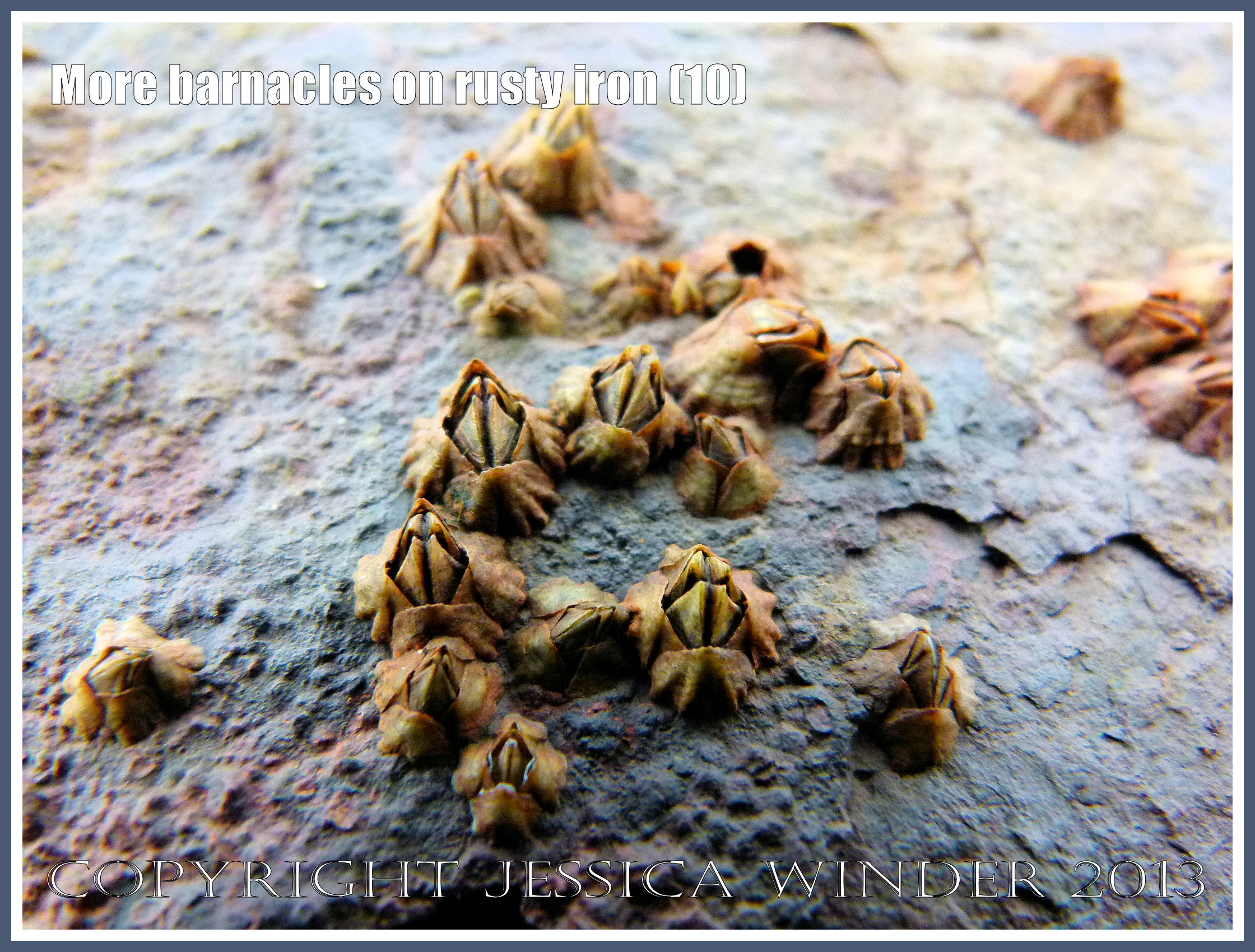 More barnacles on rusty iron (10) – Rust-stained acorn or sessile barnacles living on an iron seaside pier corroded by sea water. P1300405aBlog10