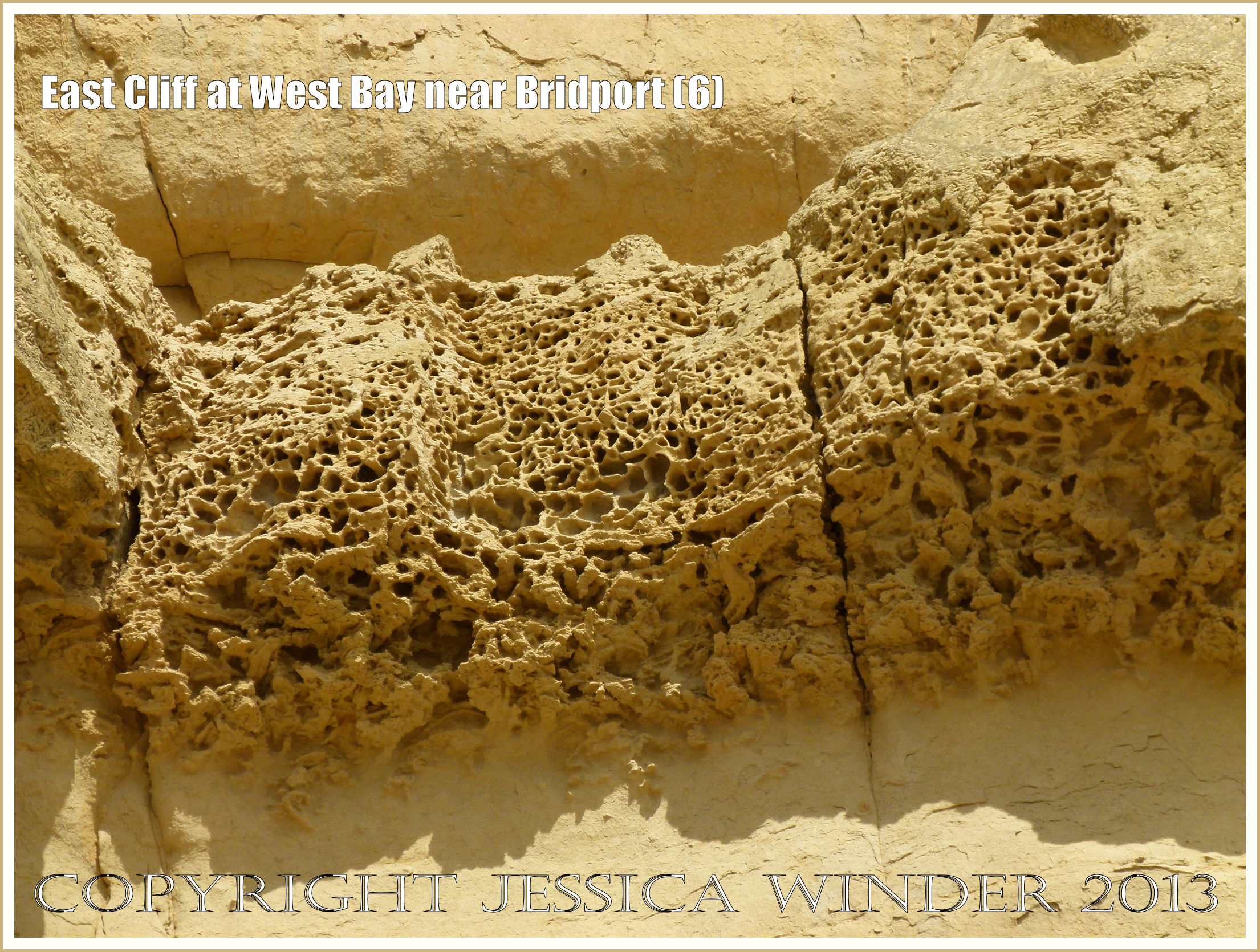 East Cliff at West Bay near Bridport (6) – The honeycomb pattern of the ledges on the cliff face is called ‘tafoni’. The tunnels of animals – like that of the decapod crustacean Thallassinoides, which constructed large horizontal burrows in the ancient sea bed – were infilled with harder, more calcium-rich sediments than the surrounding rock and thus are more resistant to erosion and stand out like networks of interconnected cords. P1250971aBlog6