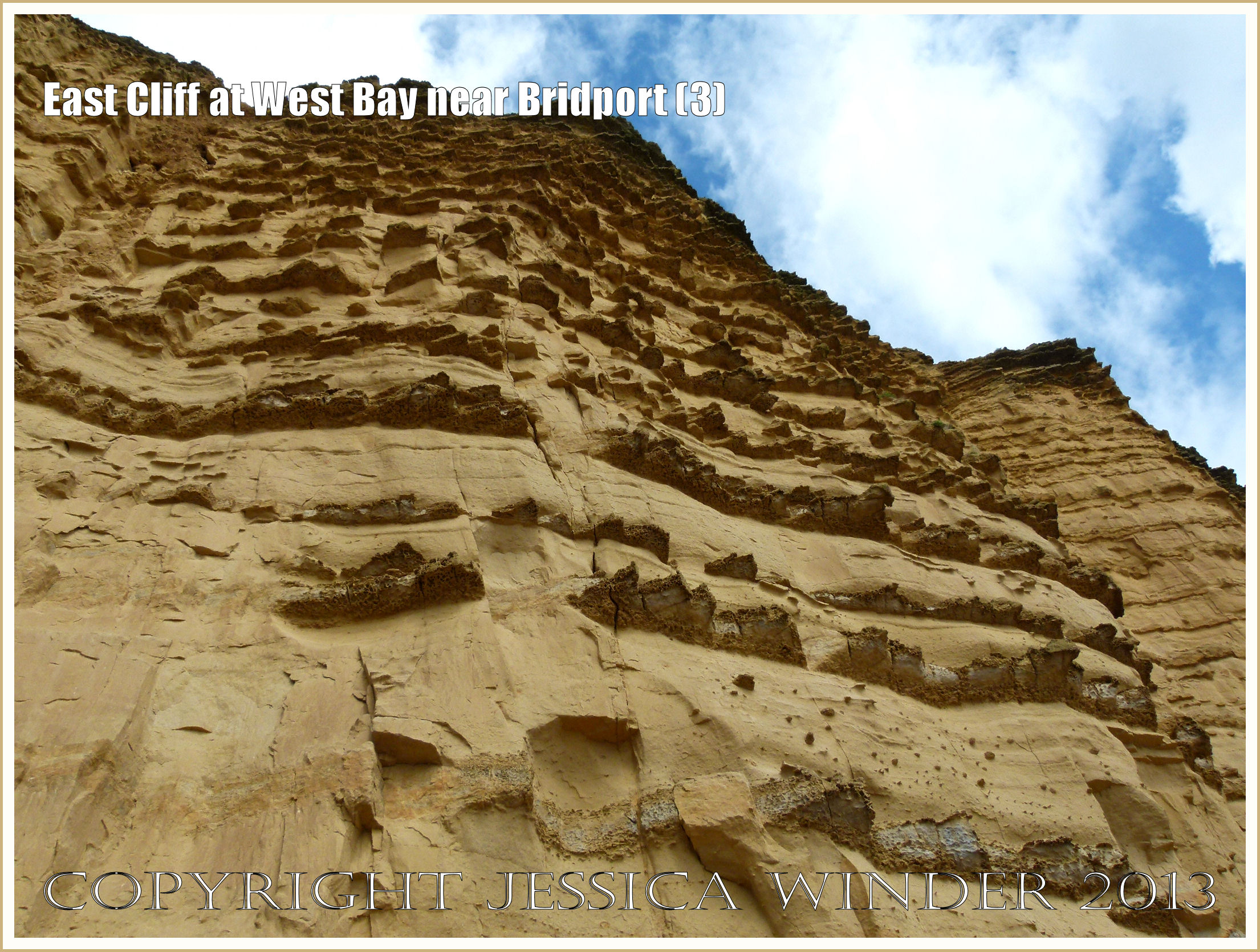 East Cliff at West Bay near Bridport (3) – The cliff is made of sandstone of the Bridport Sand Formation which is an Upper Lias rock of the Jurassic period. Wind-blown sand has weathered the rock to leave bands of harder calcareous sandstone protruding like jagged ledges. The softer sandstone layers become progressively thinner towards the top of the cliff. P1250998aBlog3