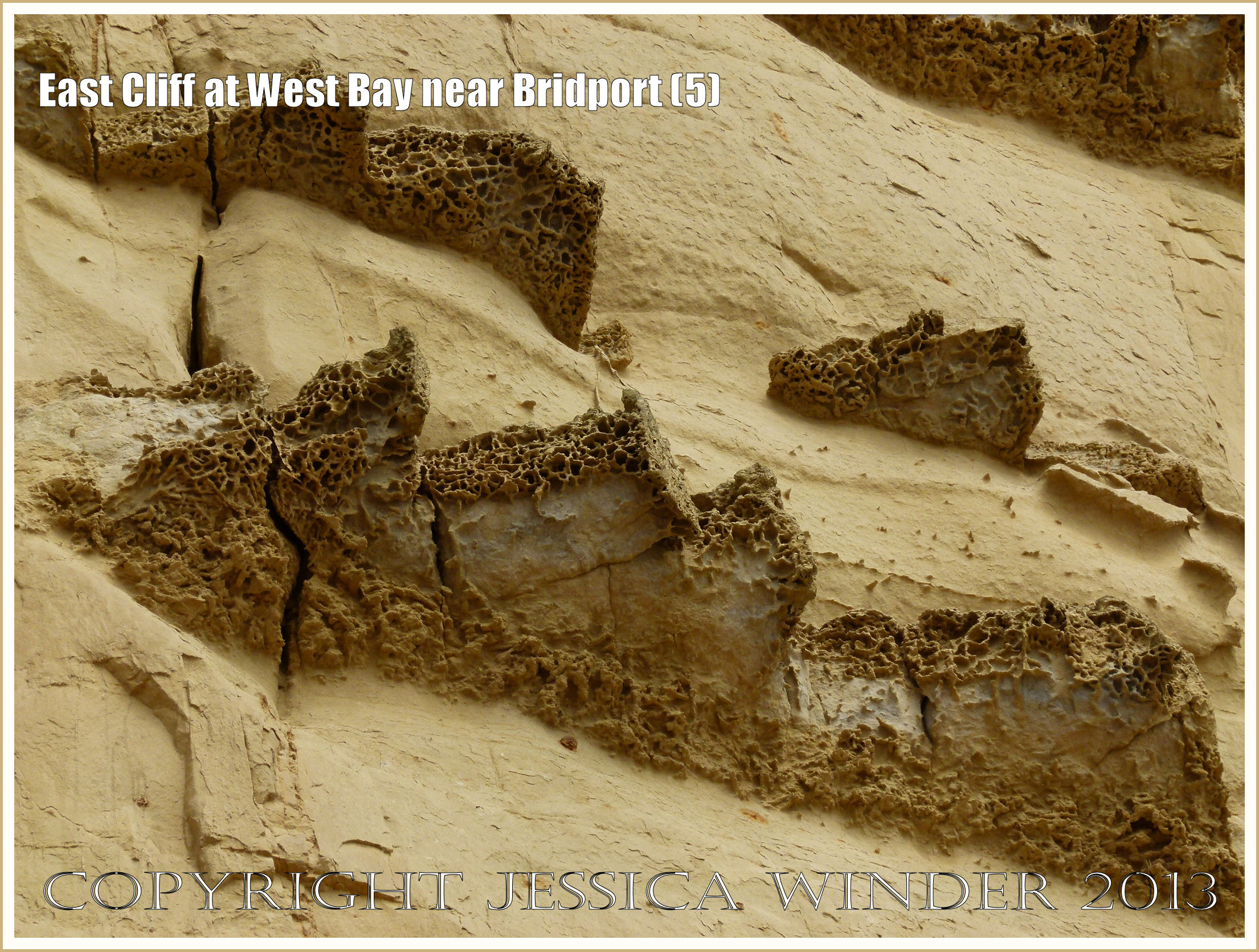 East Cliff at West Bay near Bridport (5) – The honeycomb texture of the harder layers forming ledges on the cliff is due to the action of wind-blown sand differentially eroding the rock. These hard calcareous bands are riddled with trace fossils of the burrows of animals that once lived in the sea bed. P1260003aBlog5