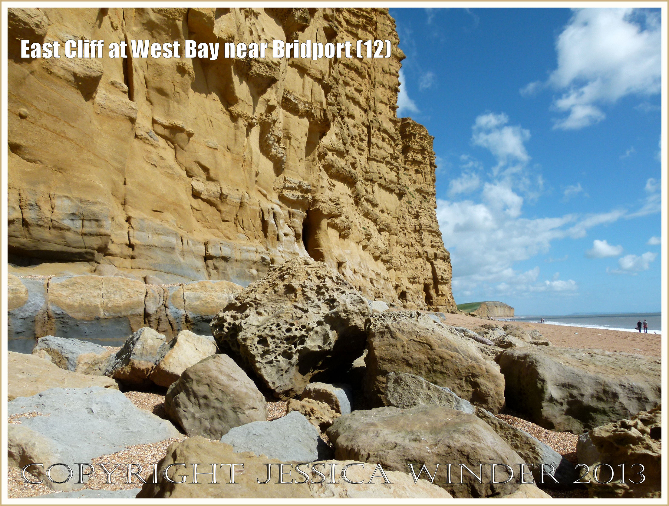 East Cliff at West Bay near Bridport (12) – A group of large boulders on the beach representing a rock fall. Rock falls are caused by weathering out of the harder bands of carbonate cemented rock high on the cliff face and also by undercutting of the cliff at its base by the sea. P1260057aBlog12
