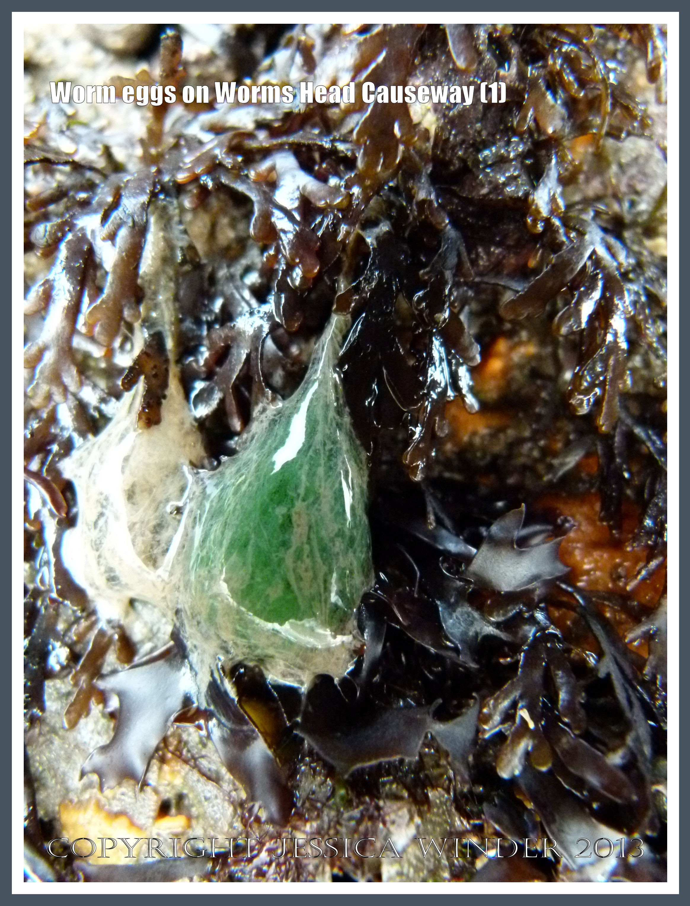Worm Eggs on Worms Head Causeway (1) – Small glistening gelatinous blob of minute green eggs attached to seaweed on the Worms Head Causeway, Gower, South Wales – thought to be the eggs of a marine polychaete worm of the Paddleworm Family (Phyllodocidae) – probably Phyllodoce maculata (Linnaeus) or Eulalia viridis (Linnaeus). P1320302aBlog1