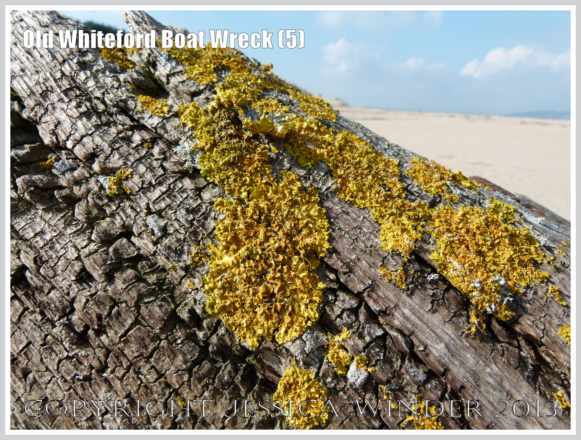 Old Whiteford Boat Wreck (5) – Weathered ships timbers with yellow lichen, and rusting ironwork of a small boat wreck at Whiteford Point, Gower, South Wales. P1330122aBlog5
