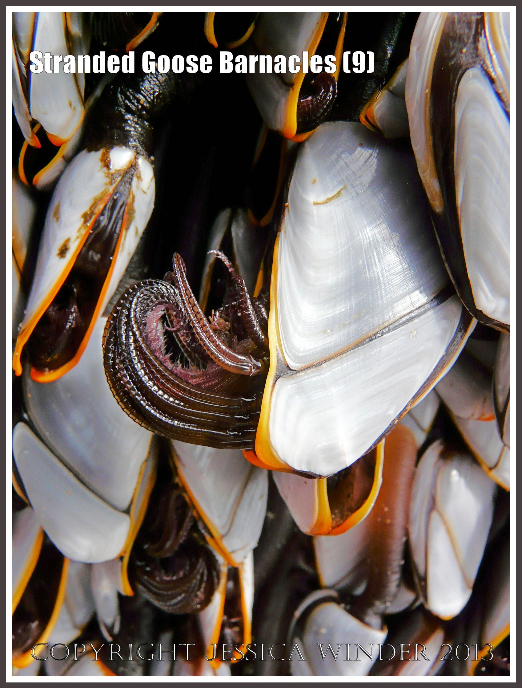 Stranded Goose Barnacles (9) – Living specimens of the Common Goose barnacle, Lepas anatifera Linnaeus, washed ashore at Rhossili Beach, Gower, South Wales, showing fringed cirripedes being extended and withdrawn in an automatic feeding behaviour. P1010990aBlog9