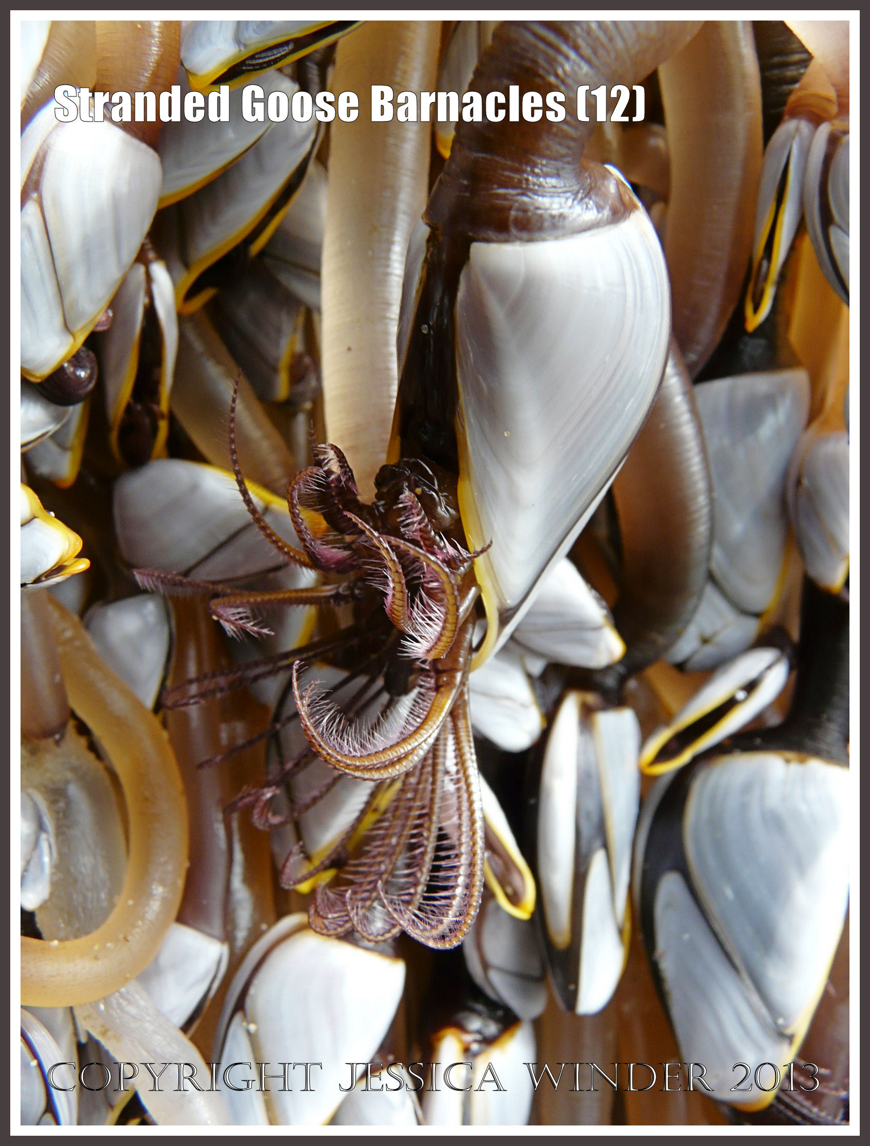 Stranded Goose Barnacles (12) – Living specimens of the Common Goose barnacle, Lepas anatifera Linnaeus, washed ashore at Rhossili Beach, Gower, South Wales, showing fringed cirripedes being extended and withdrawn in an automatic feeding behaviour. P1010994aBlog12