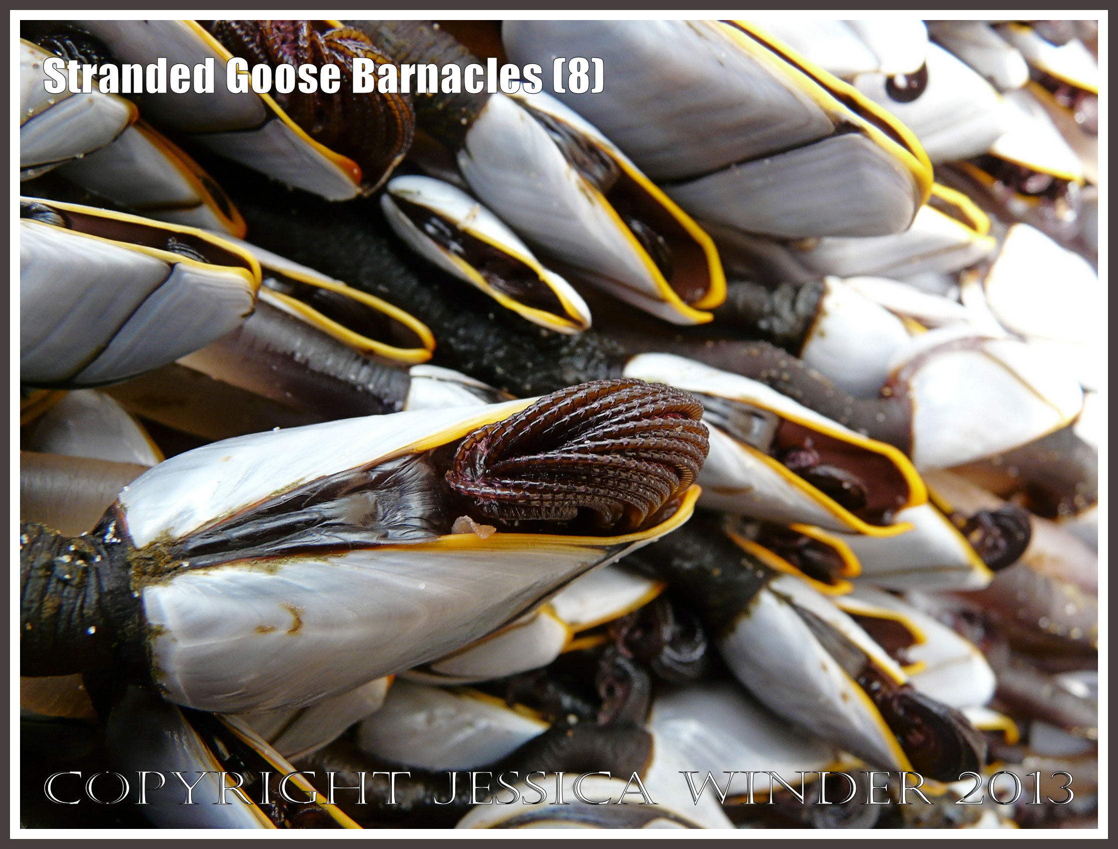 Stranded Goose Barnacles (8) – Living specimens of the Common Goose barnacle, Lepas anatifera Linnaeus, washed ashore at Rhossili Beach, Gower, South Wales, showing fringed cirripedes being extended and withdrawn in an automatic feeding behaviour. P1020042aBlog8